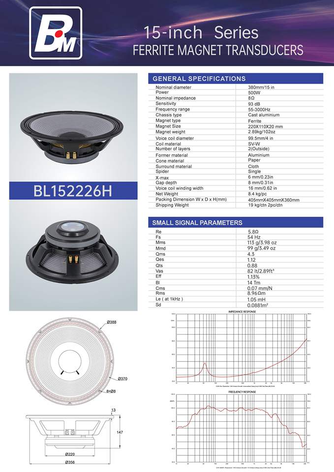 วูฟเฟอร์คุณภาพสูงขนาด 15 นิ้ว แม่เหล็ก 220 มม. วอยซ์คอยล์ 4 นิ้ว BL 152226 H 800W สำหรับลำโพง JBL สำหรับอุปกรณ์เวทีขนาดใหญ่