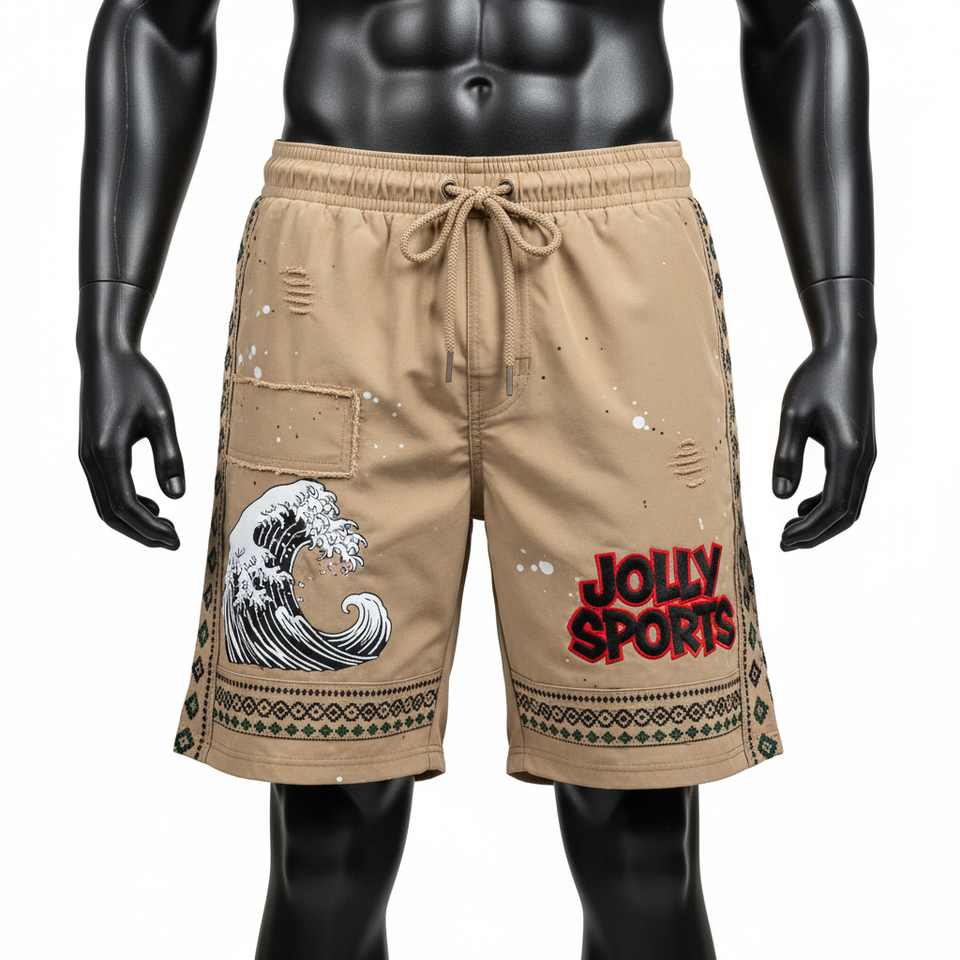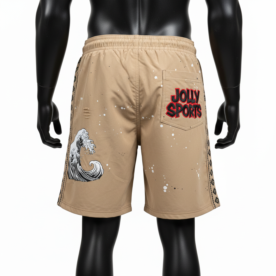 กางเกงว่ายน้ำชายคุณภาพสูง 150 GSM ผ้าไมโครไฟเบอร์โพลีเอสเตอร์ สีกากี ลายข้าง รับสกรีนโลโก้