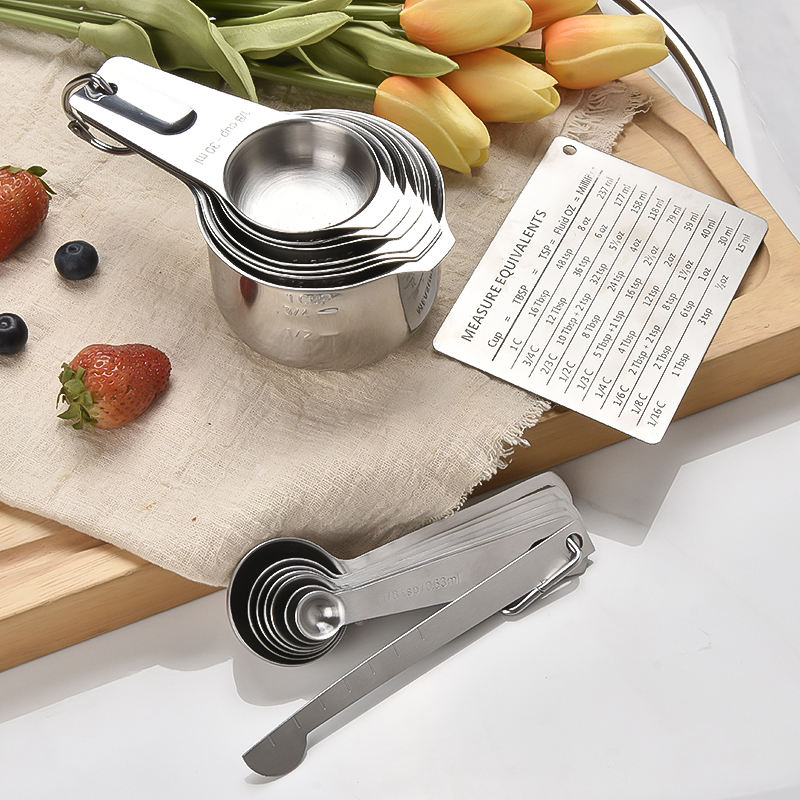 ชุดถ้วยตวงและช้อนตวงสแตนเลสเกรดอาหารคุณภาพสูง 16 ชิ้น เป็นมิตรกับสิ่งแวดล้อม สำหรับตวงของเหลวและของแห้ง