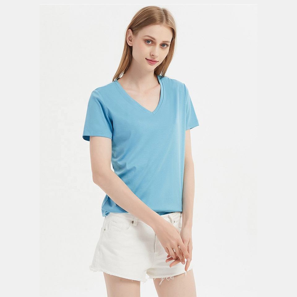 เสื้อยืดคอวีแขนสั้นสำหรับผู้หญิงผ้าฝ้ายเมอร์เซไรซ์100% 160gsm น้ำหนักเบาลำลองเนื้อนุ่มเป็นมิตรกับผิว