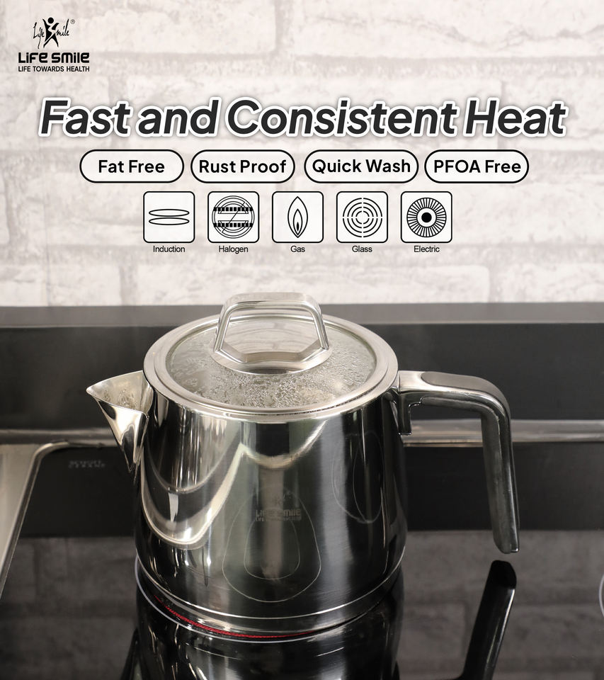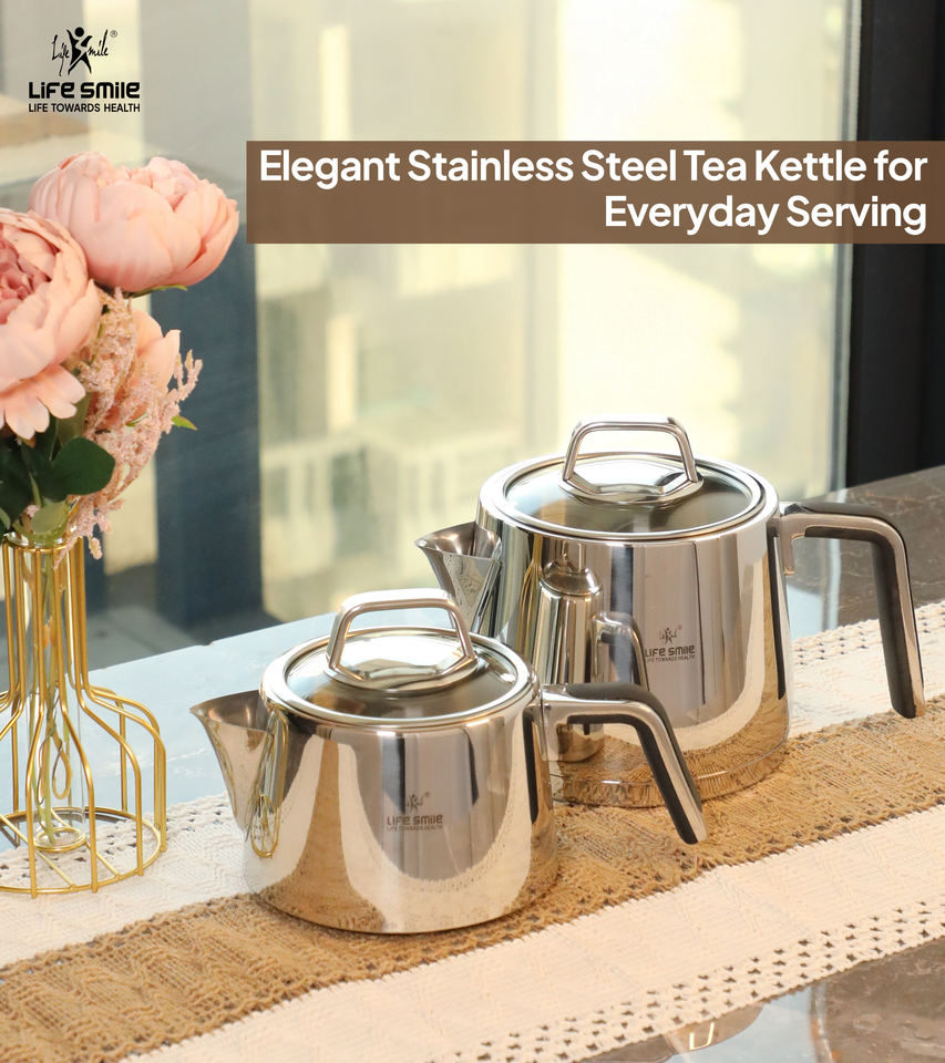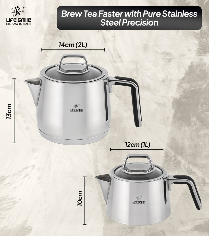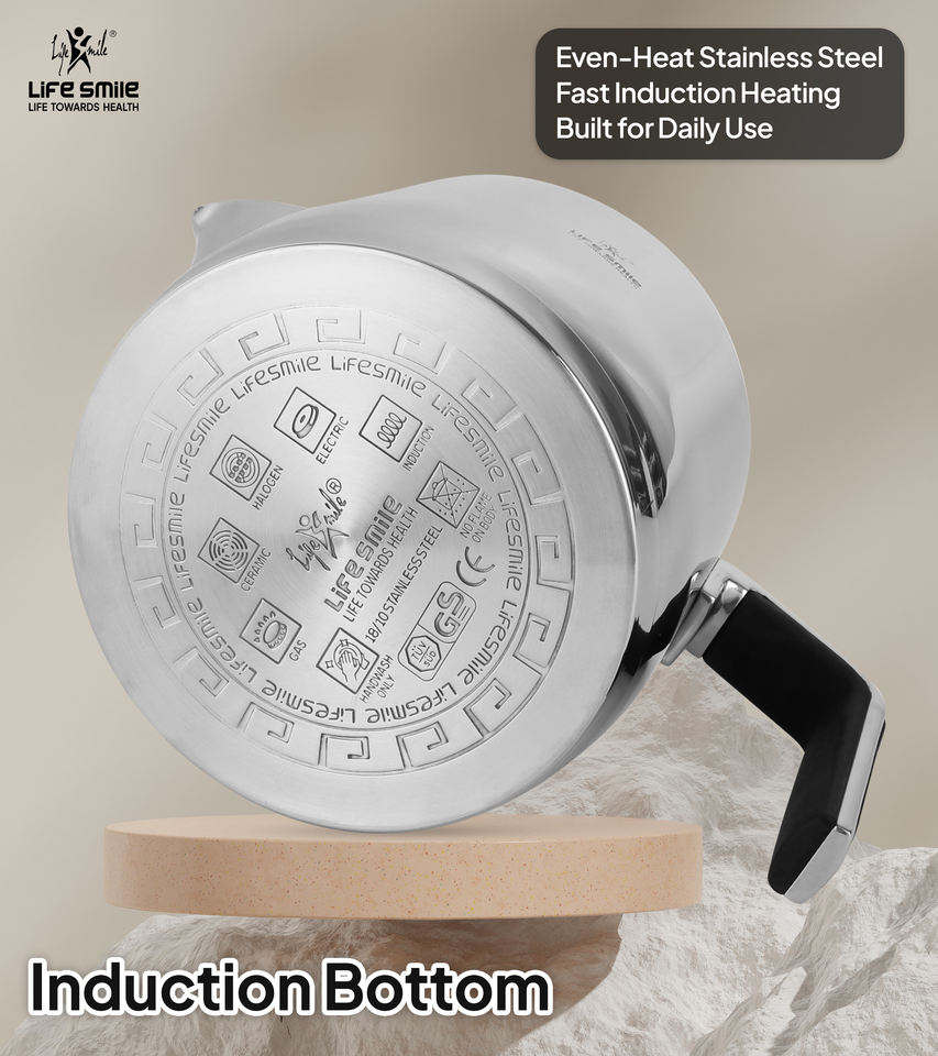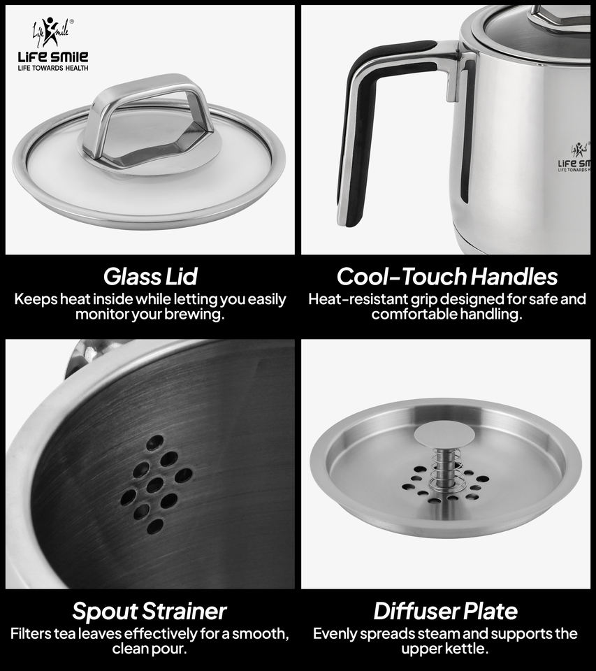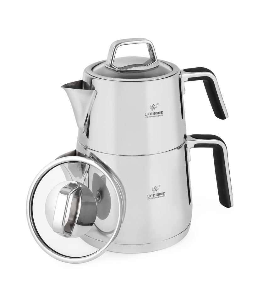 ชุดกาน้ำชาคุณภาพสูง ทำจากสแตนเลสสตีล 18/10 พร้อมฐานรองรับการใช้งานกับเตาแม่เหล็กไฟฟ้า และหูจับหุ้มซิลิโคนกันความร้อน