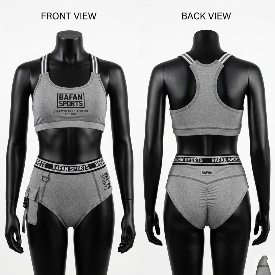 ชุดว่ายน้ำผู้หญิงคุณภาพสูง 210 GSM ผ้าไนลอนยืด สีเทา แบบสองชิ้น สายไขว้หลัง เอวสูง ลายพิมพ์โลโก้