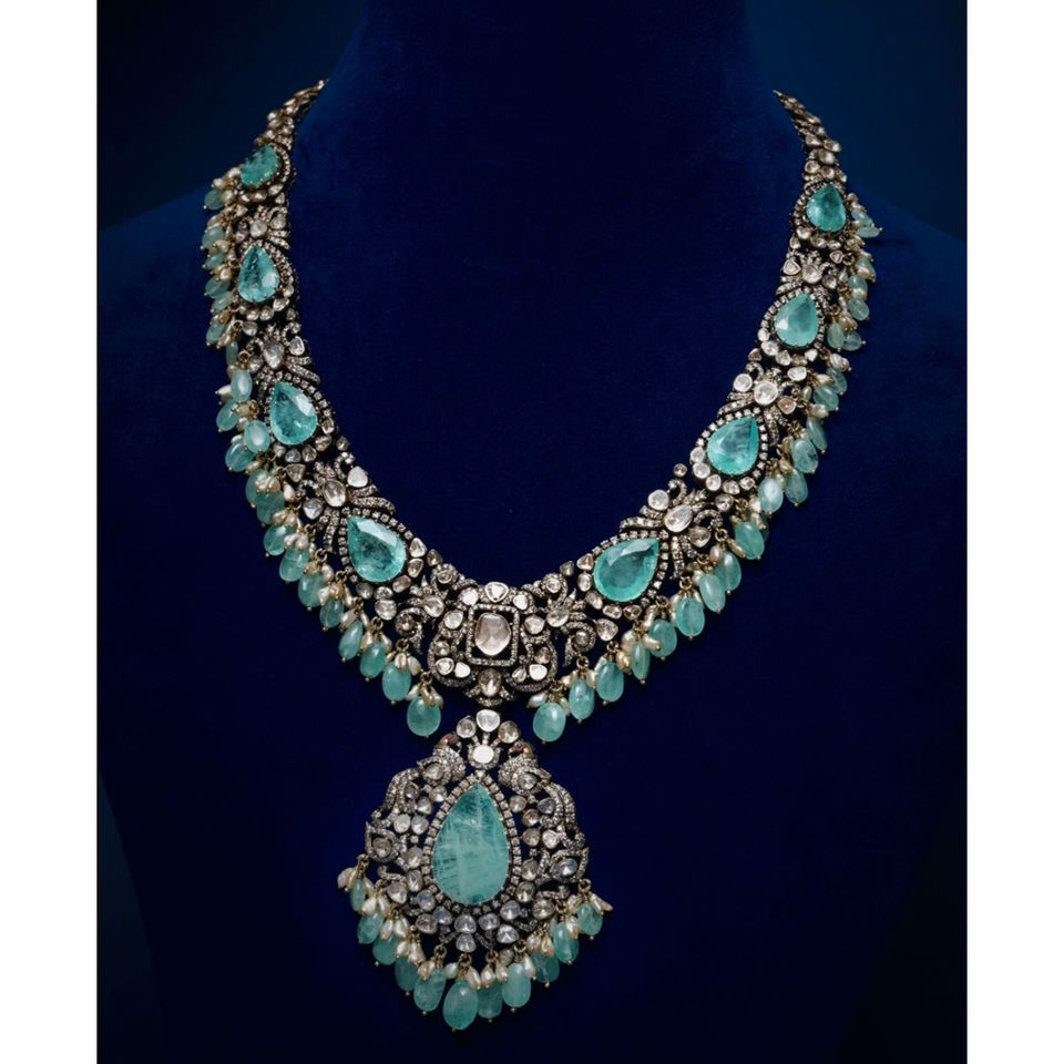 ชุดเครื่องประดับชุบทองทำด้วยมือสุดหรู24กะรัตพร้อมลูกปัดมรกตและเพทาย-สร้อยคอหรูหราสำหรับงานแต่งงานและงานเลี้ยง