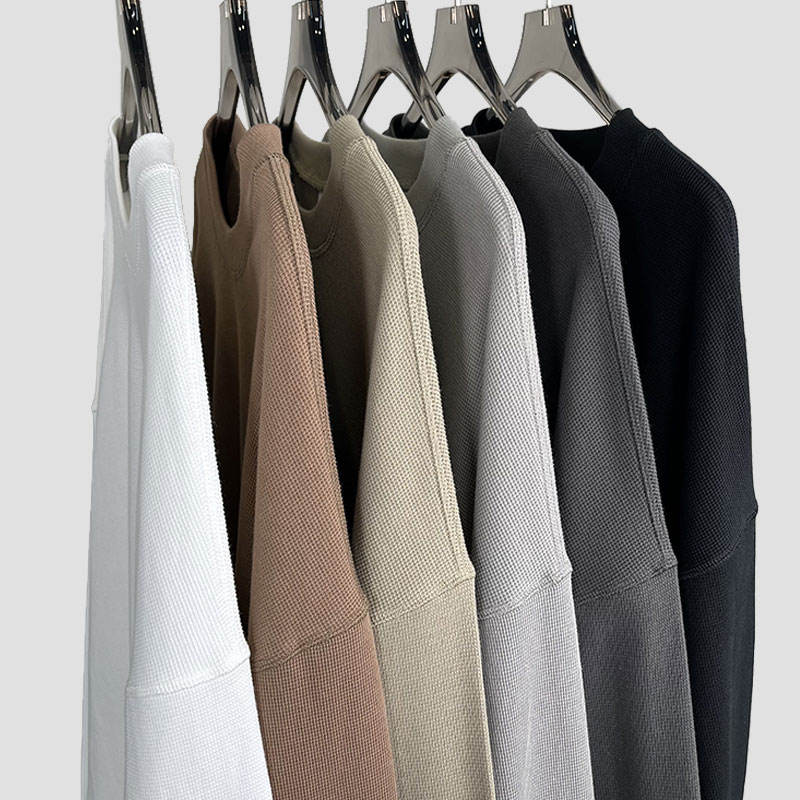 เสื้อยืดวาฟเฟิลสำหรับผู้ชายเสื้อโลโก้เปล่าคอกลมแขนยาวระบายอากาศ330GSM