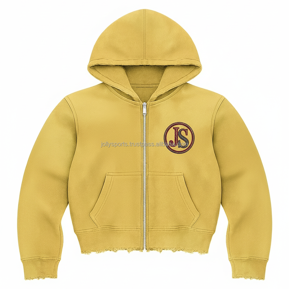 เสื้อฮู้ดซิปผ้าฟลีซผ้าฝ้ายหนา370 GSM สีเหลืองอบอุ่นปักโลโก้ได้ตามต้องการ