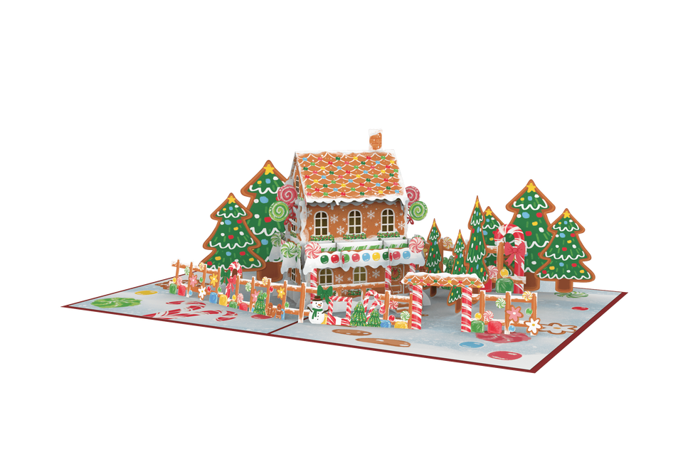 การ์ดอวยพรป๊อป3D คุณภาพสูงกระดาษศิลปะบ้านขนมปังขิงคริสต์มาสสี CMYK 127x178มม. การพิมพ์ออฟเซ็ตแบบกำหนดเอง