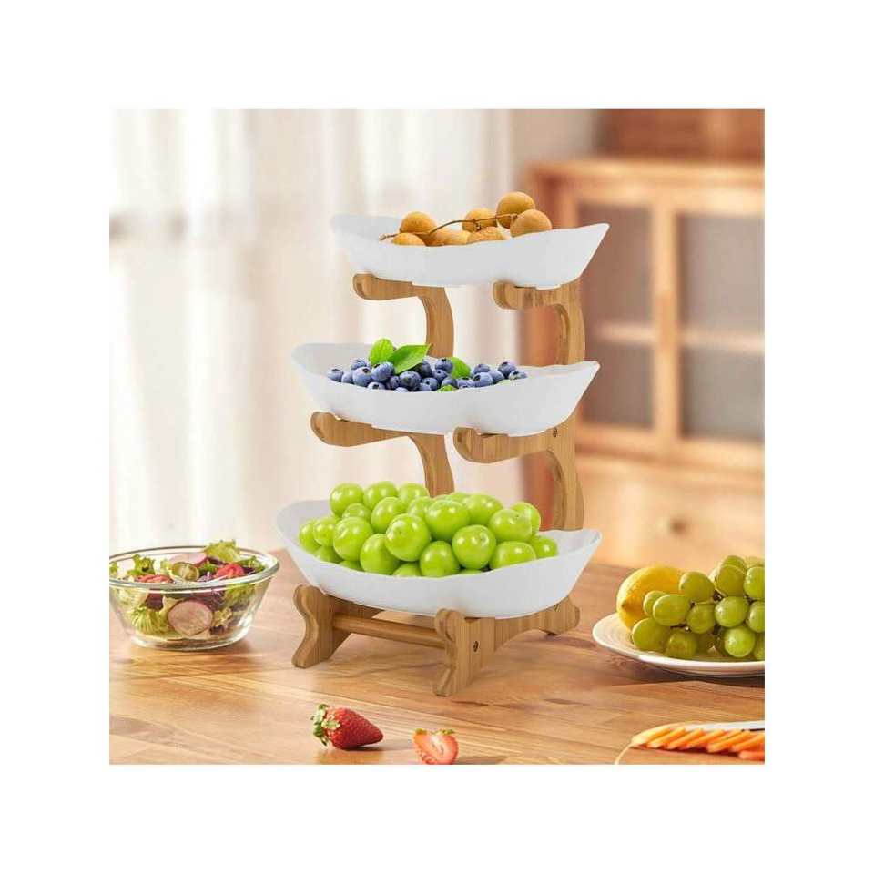 High Quality 4.5 Inch Bamboo 3-Tier Serving Bowls with Stand PP Fruit Bowl 4-Stand Snack Tray Plate Rack for Party Wedding