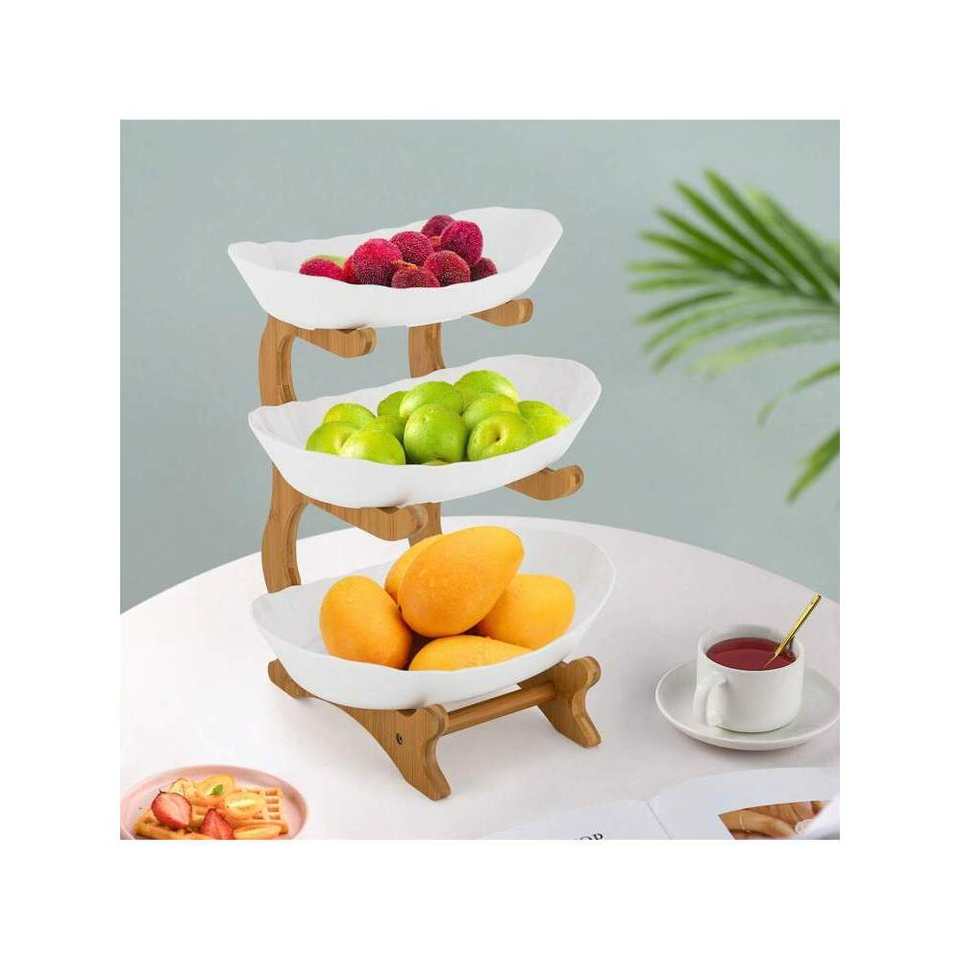 High Quality 4.5 Inch Bamboo 3-Tier Serving Bowls with Stand PP Fruit Bowl Snack Tray Plate Rack for Party Wedding
