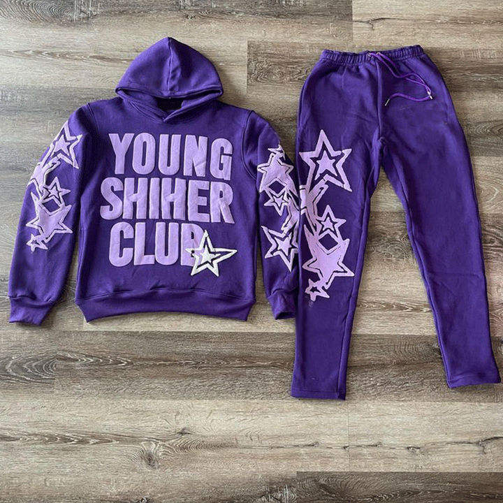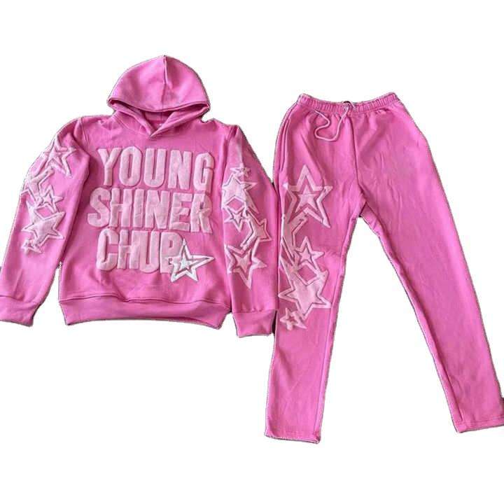 ชุดวอร์มผ้าฝ้ายสีชมพูคุณภาพสูง 400gsm พิมพ์ลายพัฟฟ์ ชุดสองชิ้น สตรีทแวร์สำหรับทุกเพศ