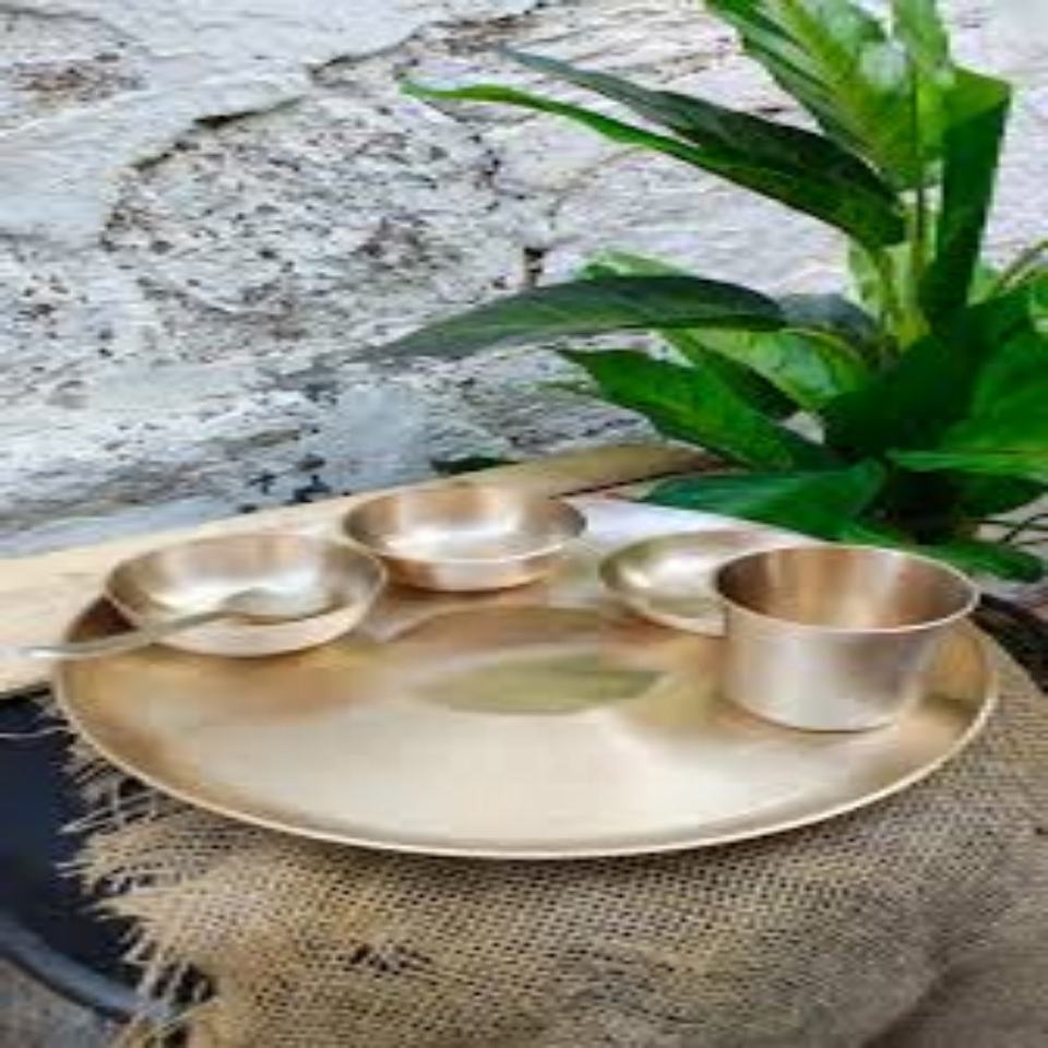 High Quality 5 Pcs Bronze / Kansa Dinnerware Thali Set With Bowls Pudding and Glass for Health Benefits and Yoga and Vintage