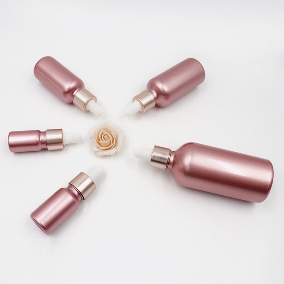 ขวดแก้วหยดสีชมพูด้านคุณภาพสูง ขนาด 5 มล. 10 มล. 15 มล. 20 มล. 30 มล. 50 มล. 100 มล. พร้อมหัวหยดสีโรสโกลด์ ขวดแก้วหยดทรงกลม