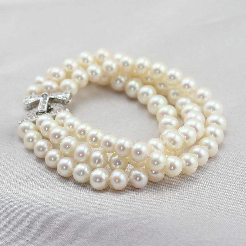 สร้อยข้อมือไข่มุกน้ำจืดคุณภาพสูง ขนาด 6-7 มม. ทรงกลม 3 แถว งานฝีมือประณีต พร้อมแหวนประดับไข่มุกหลายชั้น