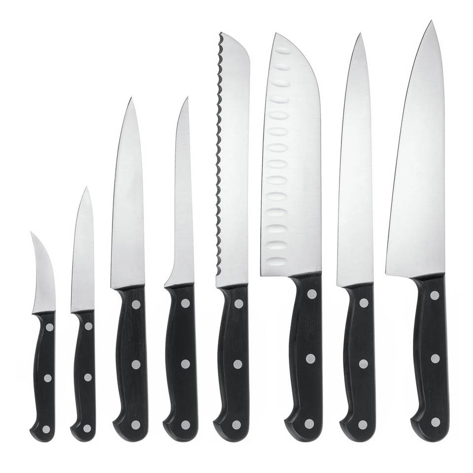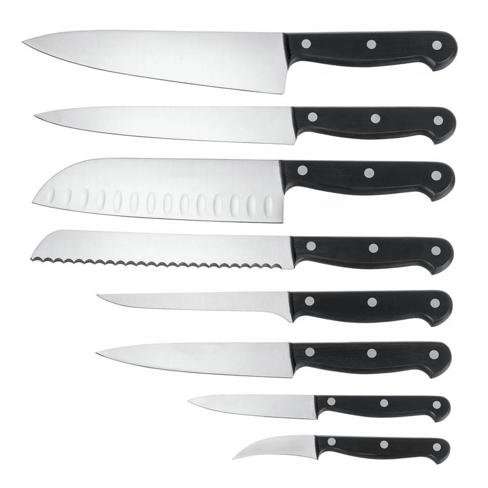 ชุดมีดเชฟสแตนเลส8ชิ้นพร้อมที่จับดีไซน์ตามหลักสรีรศาสตร์และใบมีดสำหรับทำอาหารในครัวและเตรียมอาหาร