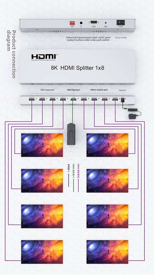 ตัวแยกสัญญาณ8K 2.1 HDMI 8พอร์ต8Way 8K 120Hz 7860x4320 3D ตัวแยกวิดีโอ EDID 1x8 udid