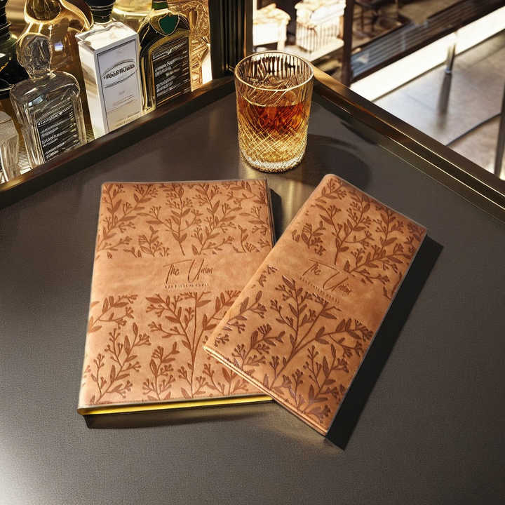 คำอธิบาย:แฟ้มเมนูหนังเทียมพร้อมโลโก้ชุบนิกเกิล
