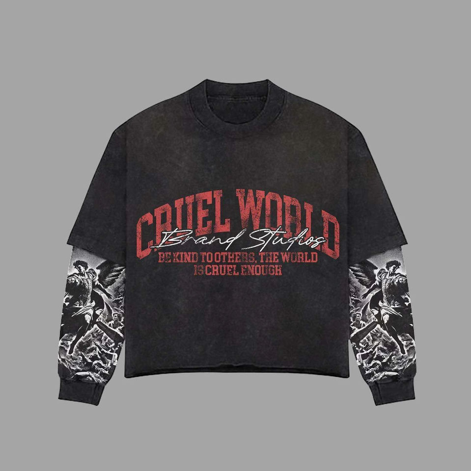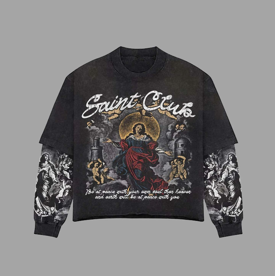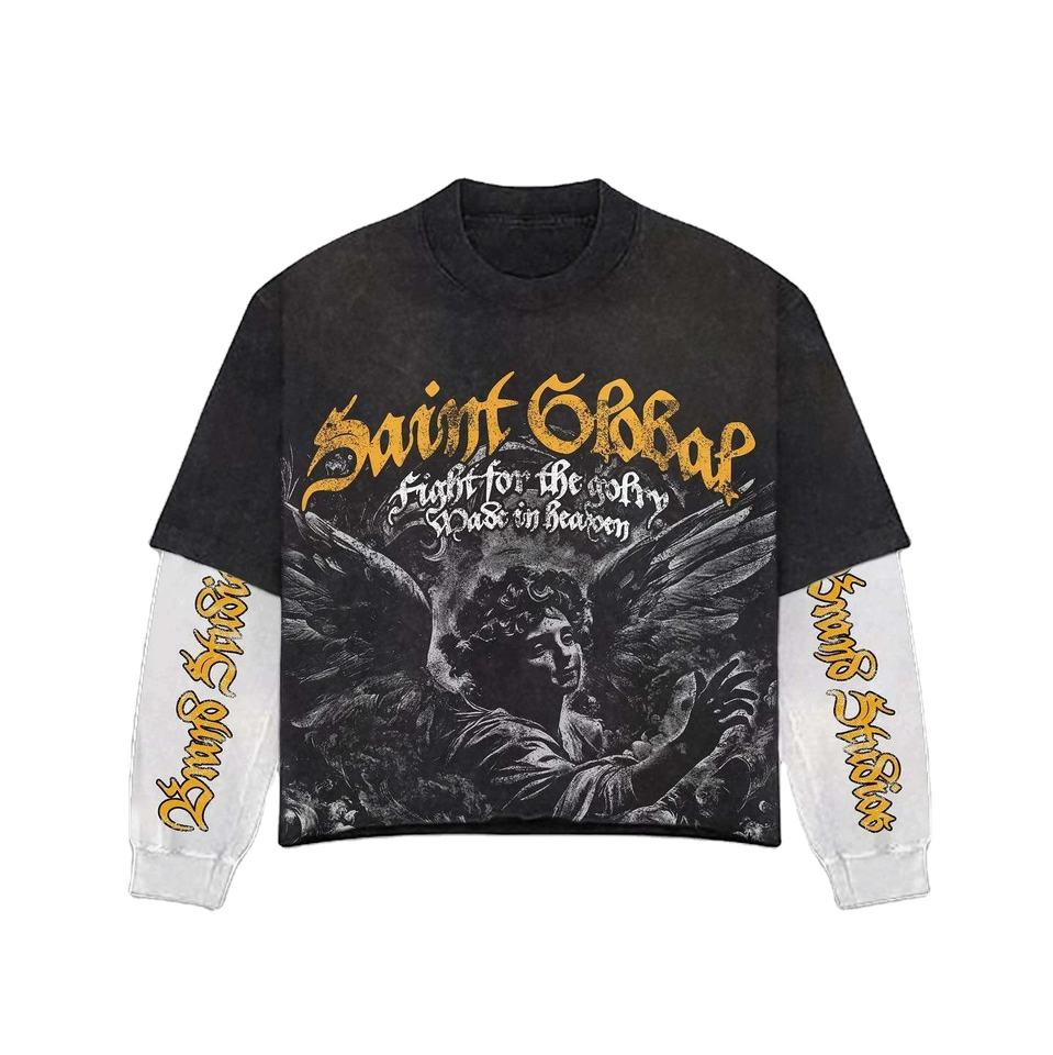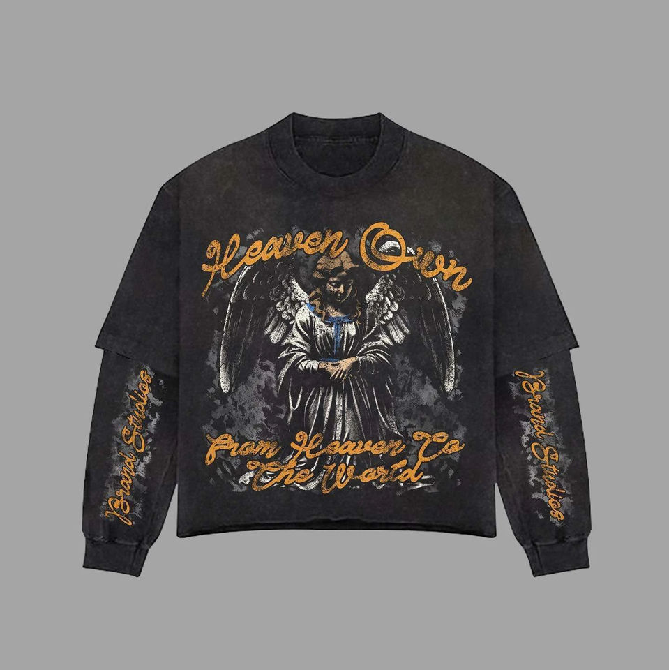 เสื้อสเวตเชิ้ตทรงบ็อกซี่ลายกราฟิกพิมพ์ลายแบบแอซิดวอชคุณภาพสูงสำหรับผู้ชาย เสื้อยืดแขนยาวสองชั้นทรงโอเวอร์ไซส์