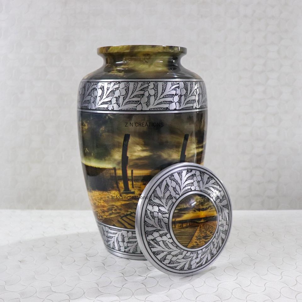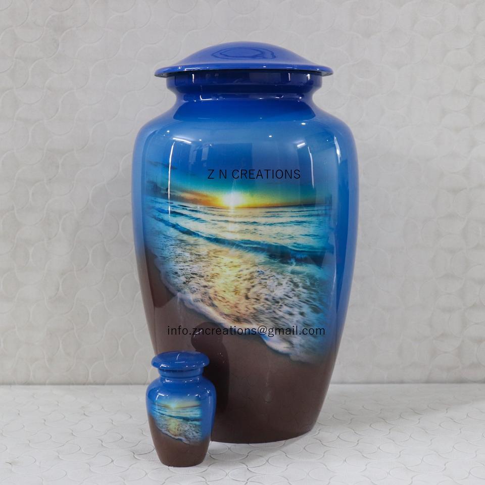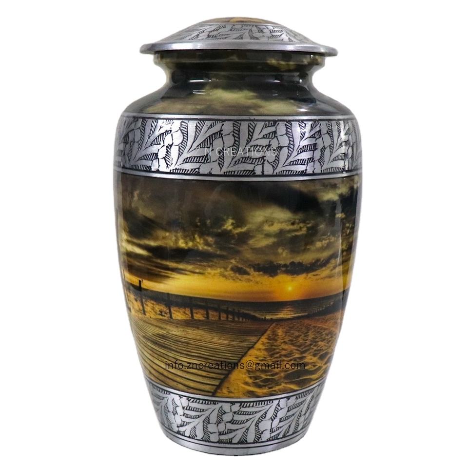 โกศบรรจุอัฐิสำหรับผู้ใหญ่คุณภาพสูง ทำจากอะลูมิเนียม สลักภาพชายหาดยามพระอาทิตย์ตกที่สวยงาม ของที่ระลึกดิจิทัลแบบกำหนดเองสำหรับใส่เถ้ากระดูกมนุษย์ในพิธีศพ
