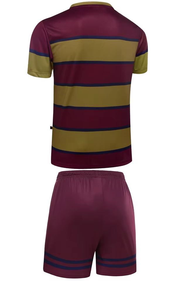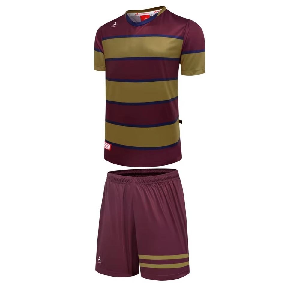ชุดฟุตบอลผู้ใหญ่คุณภาพสูง เสื้อและกางเกงขาสั้นผ้าโพลีเอสเตอร์ 100% สีและโลโก้สั่งทำได้ ระบายอากาศ แห้งเร็ว คอวี
