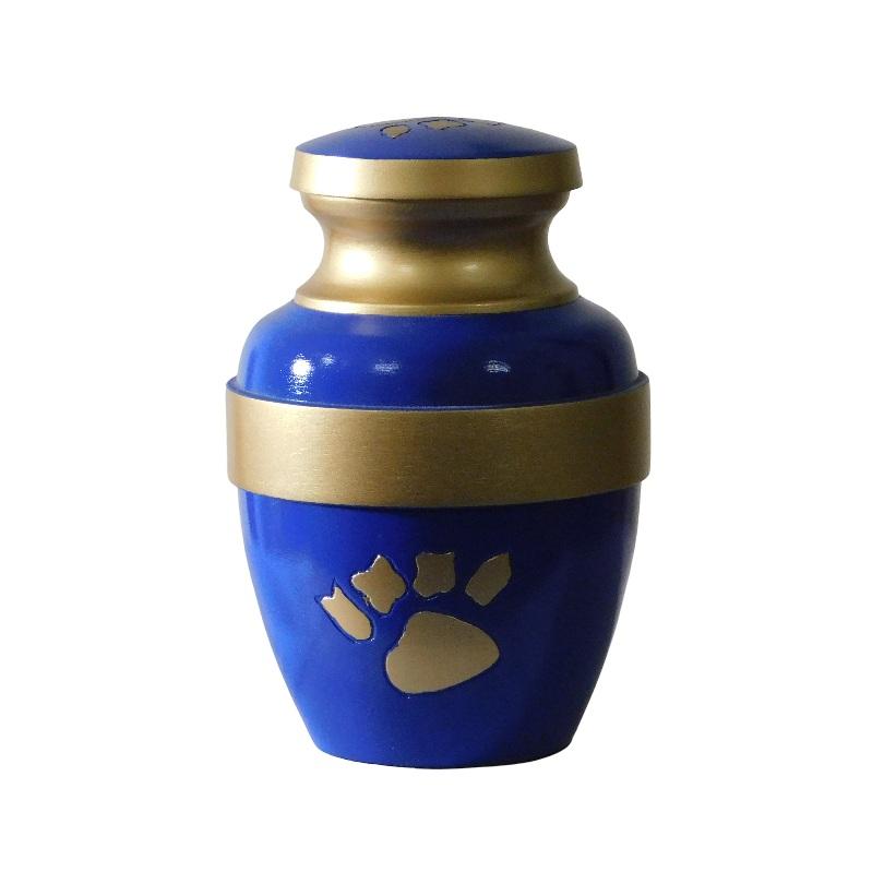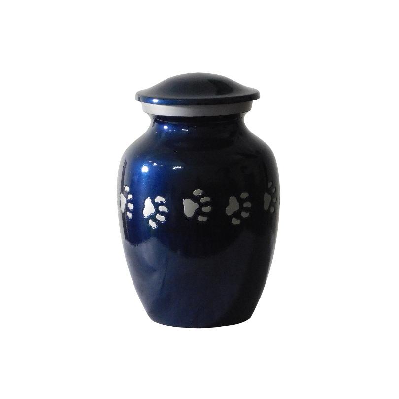 โกศอะลูมิเนียมสำหรับงานศพสัตว์เลี้ยงพร้อมอุ้งเท้าพิมพ์สีทองและสีน้ำเงินโกศโลหะสำเร็จรูปสำหรับขี้เถ้ามนุษย์