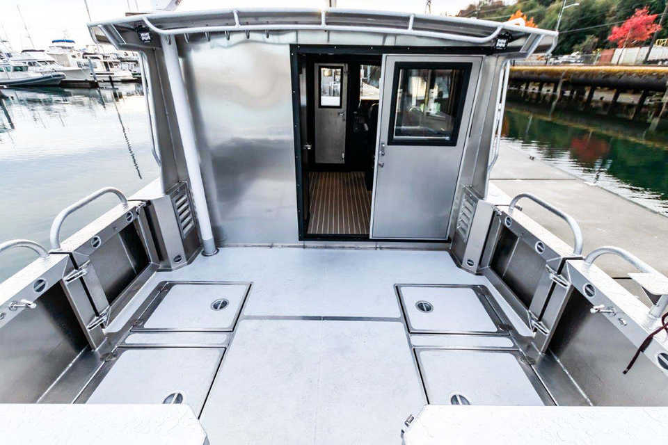วัสดุตัวเรืออลูมิเนียม: การใช้โลหะผสมอลูมิเนียมเกรดทะเลทำให้เรือแฝดมีน้ำหนักเบาและทนทาน มอบทางเลือกที่ยาวนานและบำรุงรักษาน้อยสำหรับการตกปลาและการล่องเรือในน้ำทะเล