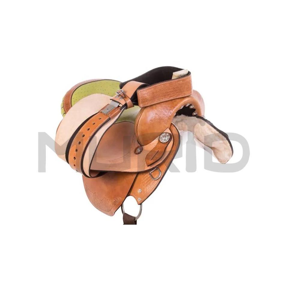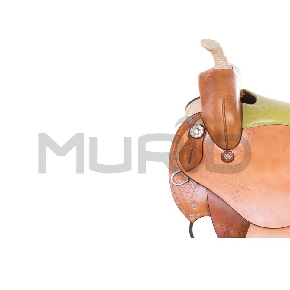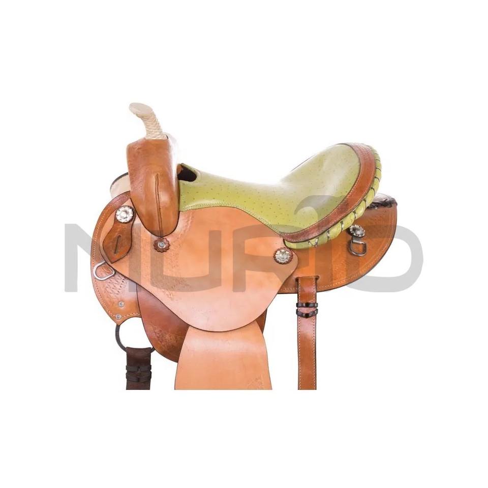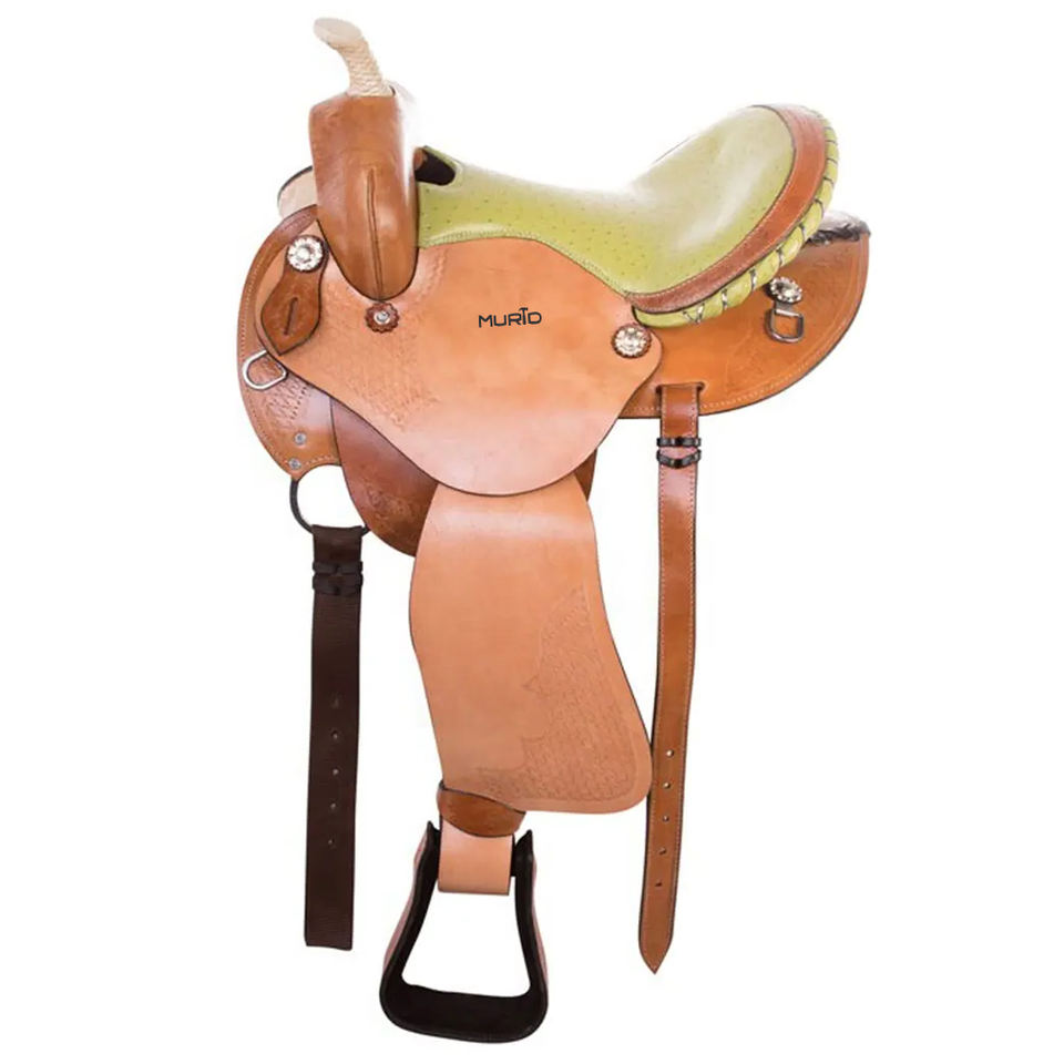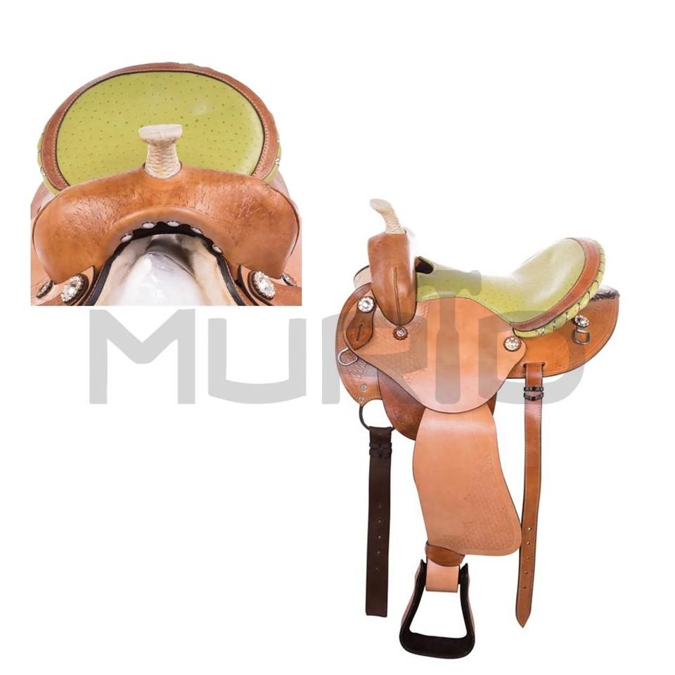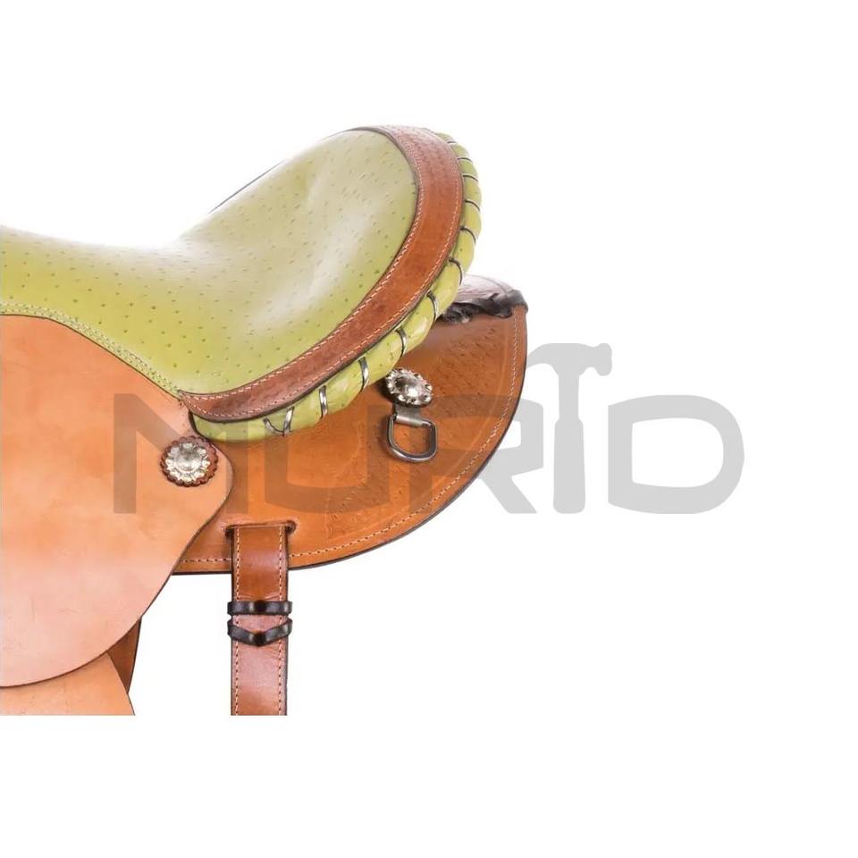 อานม้าม้าสีเขียวสไตล์อเมริกันพร้อมหนังแท้ทรงถังสำหรับแข่งวัวสีเขียวลายนกกระจอกเทศ