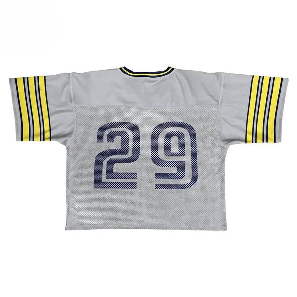 เสื้อครอปท็อปอเมริกันฟุตบอลคุณภาพสูง พิมพ์ลายแบบซับลิเมชั่น ชื่อทีมและหมายเลขแบบกำหนดเอง ชุดยูนิฟอร์ม ไซส์พลัส 100% โพลีเอสเตอร์