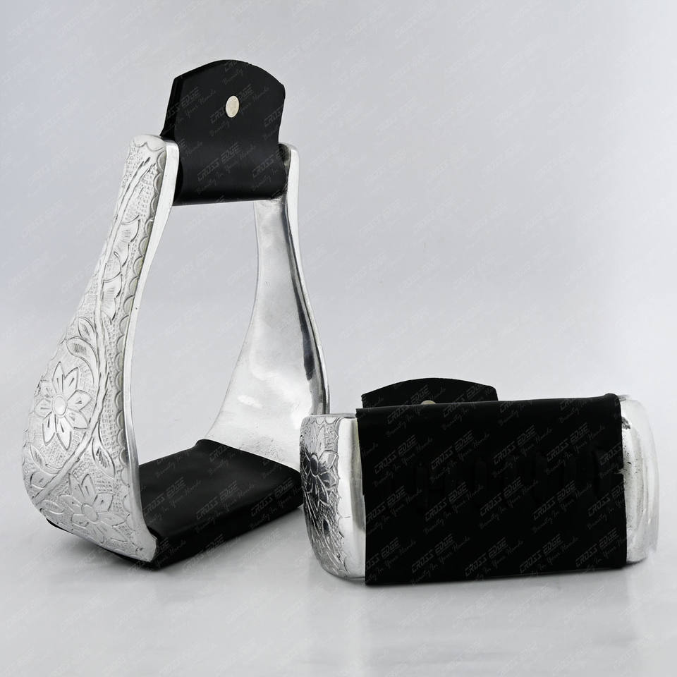 แผ่นเหล็กโกลนแบบตะวันตกที่มีมุมคุณภาพสูงแผ่นอลูมิเนียมสำหรับใช้ในการขี่ม้าขี่ม้าแกะสลักอย่างสวยงาม