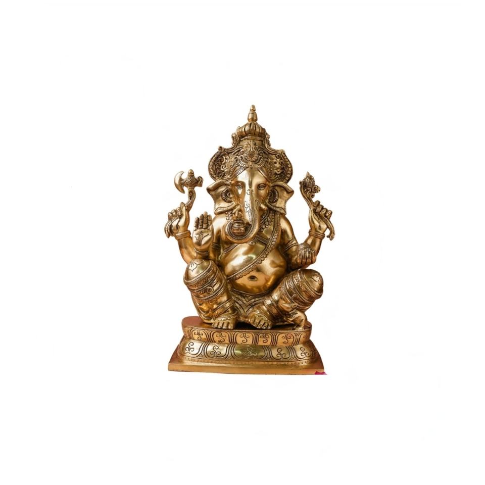 รูปปั้นพระพิฆเนศทองเหลืองโบราณคุณภาพสูง สำหรับตกแต่งบ้าน ของตกแต่งพิธีกรรมฮินดู พร้อมมงกุฎ