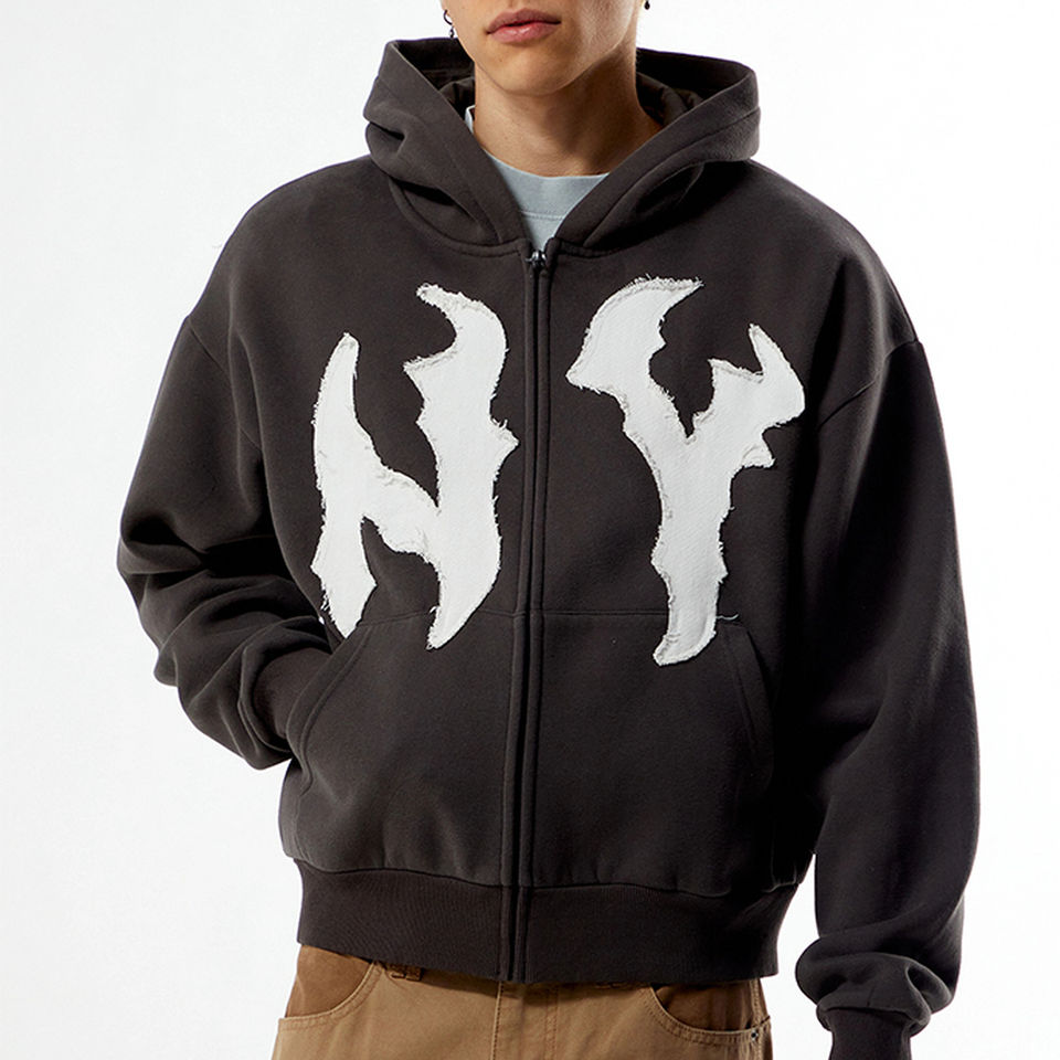 เสื้อฮู้ดดี้สตรีทแวร์คุณภาพสูง ปักลายแบบแอพพลิเค ซิปหน้า ผ้าเฟรนช์เทอร์รี่แบบวินเทจฟอกสี งานปักแบบดิสเทรส รับตัดเย็บเสื้อผ้าตามสั่ง