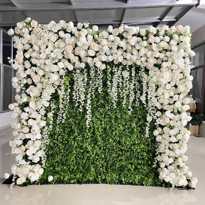 ผนังดอกไม้ประดิษฐ์คุณภาพสูง 3 มิติ ผนังดอกไม้ผ้าไหมสีขาวสำหรับตกแต่งงานแต่งงาน ฉากหลังดอกกุหลาบปลอม
