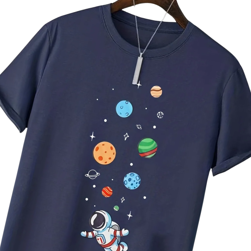 เสื้อยืดพิมพ์ลายนักบินอวกาศเสื้อยืดลายดาวเคราะห์อวกาศเสื้อยืดลายกราฟิกสำหรับทุกเพศเสื้อผ้าฝ้ายลำลองแนวสตรีทเสื้อแขนสั้น OEM โลโก้ตามสั่ง