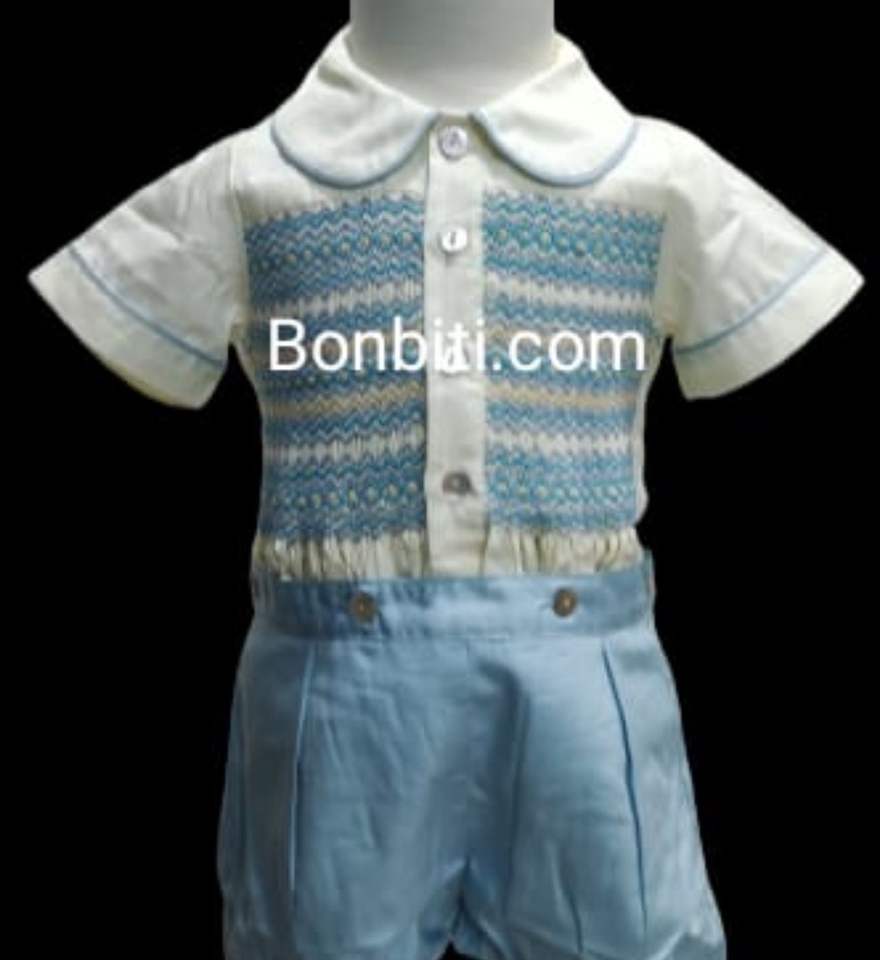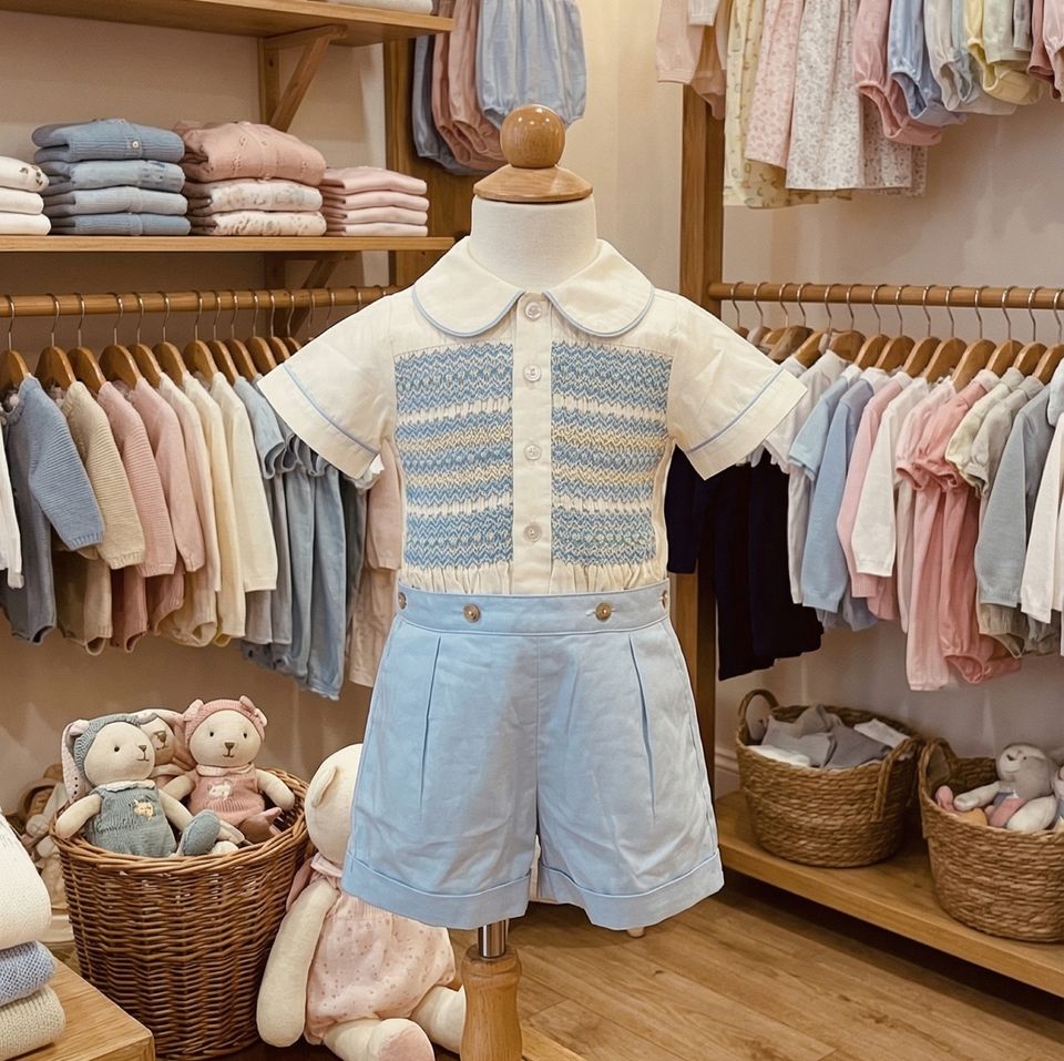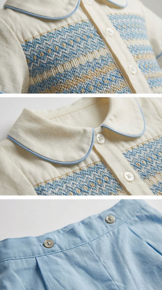 ชุดรอมเปอร์เด็กผู้ชายสีฟ้าคุณภาพสูง แขนสั้น แต่งสม็อคด้วยมือ ชุดคลุมขาสั้นคลาสสิก เหมาะสำหรับฤดูร้อน ผลิตตามแบบ OEM