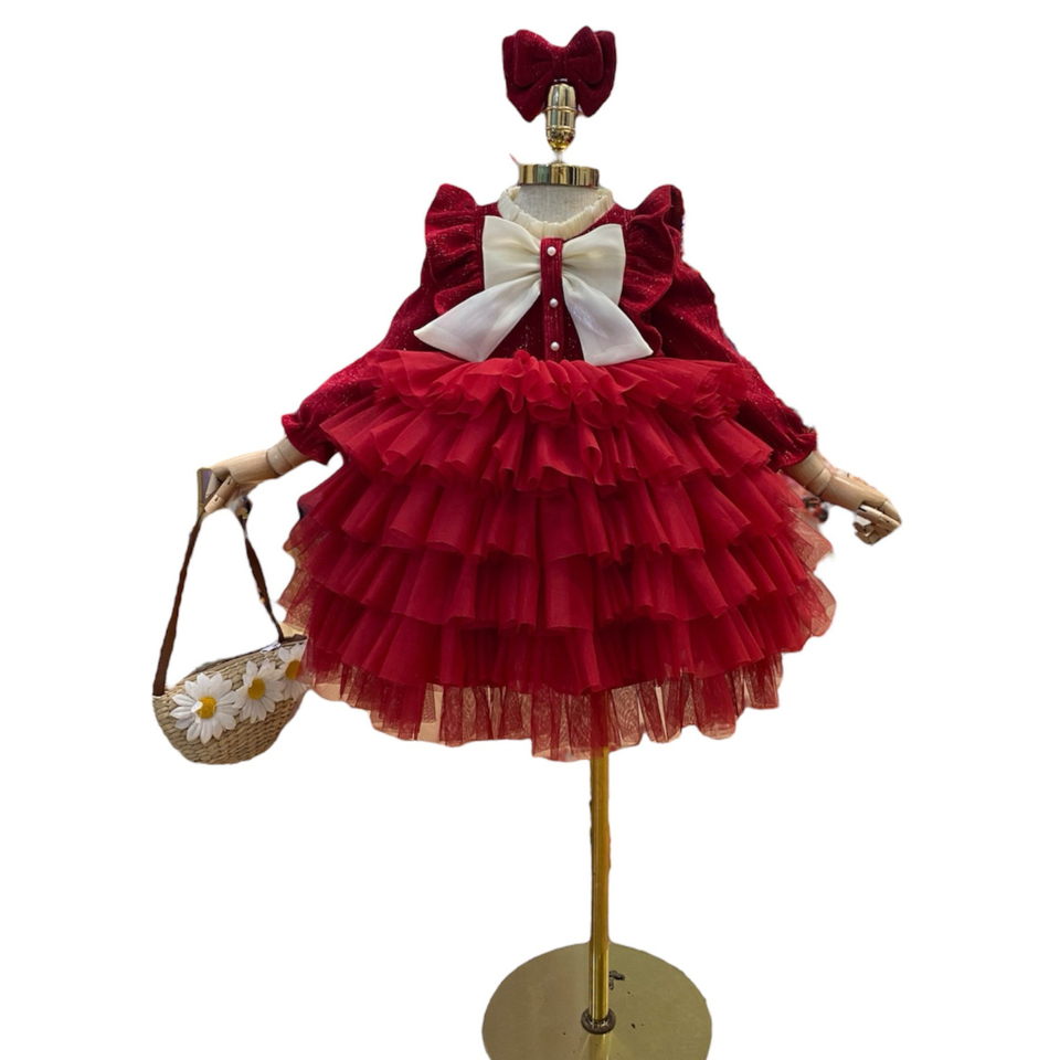 ชุดเดรสงานเลี้ยงเจ้าหญิงสำหรับเด็กผู้หญิงชุดเดรส3D แขนสั้นสไตล์ตะวันตกที่มีชั้นการตกแต่งดอกไม้บวก