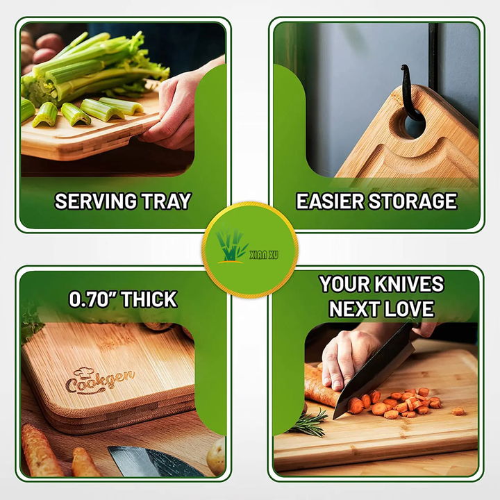 ชุดเขียงไม้ไผ่คุณภาพสูง พร้อมร่องสำหรับน้ำ ด้ามจับ รองรับการปรับแต่ง OEM สำหรับการหั่น