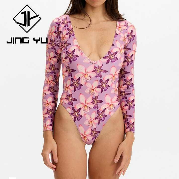 ชุดว่ายน้ำวันพีซคุณภาพสูง ลายชายหาด แขนยาว ป้องกันแสงแดด คอวี ผลิตจากผ้ารีไซเคิล รับสั่งทำ