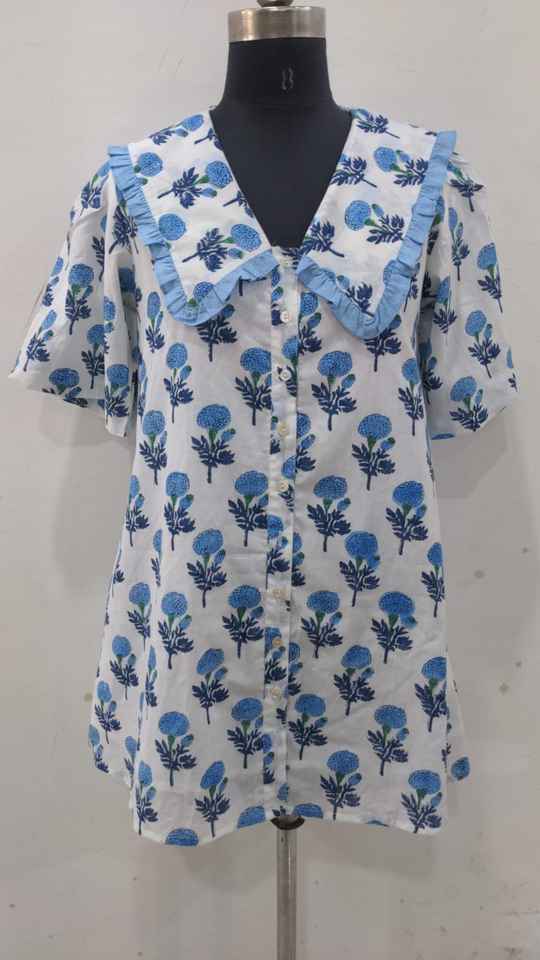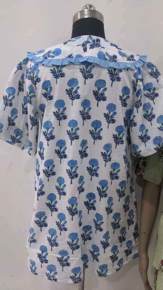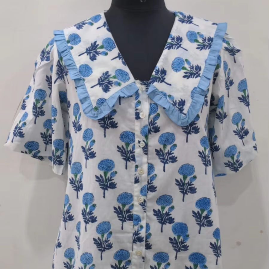 เสื้อพิมพ์ลายดอกไม้สำหรับผู้หญิงผ้าฝ้ายลำลองพิมพ์ลายบล็อกด้วยมือสวยงาม