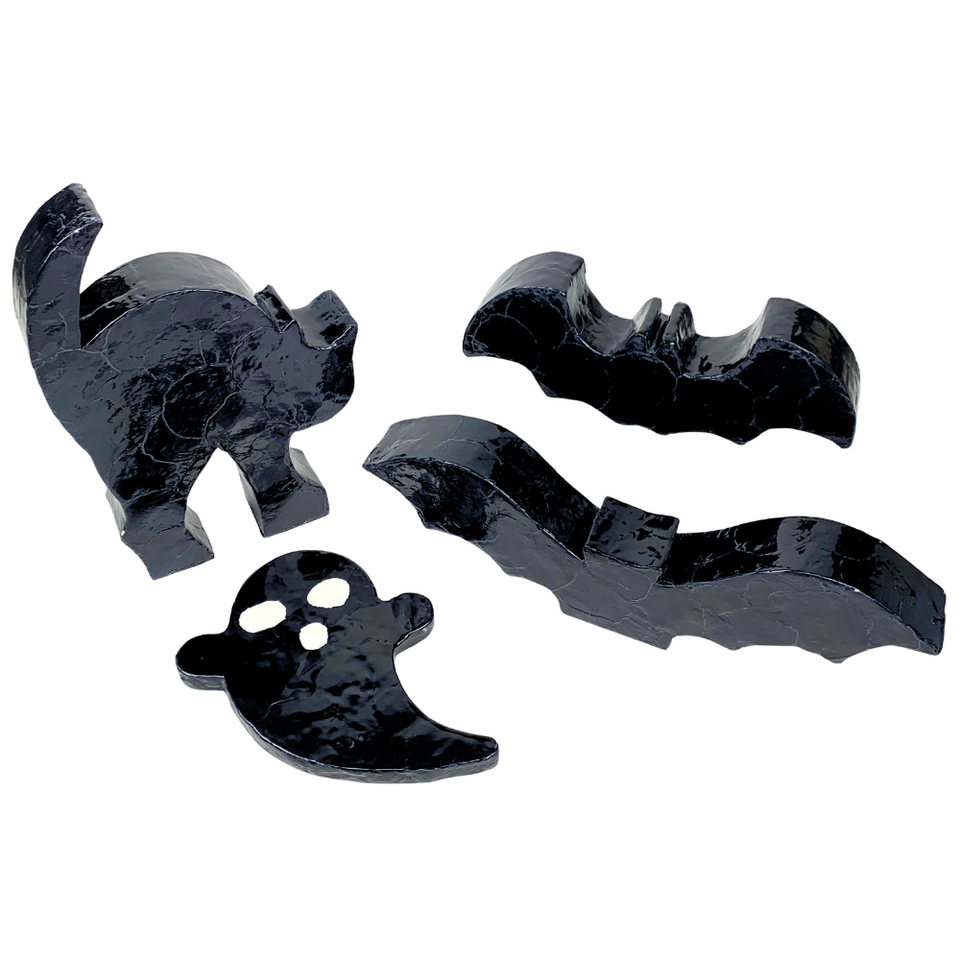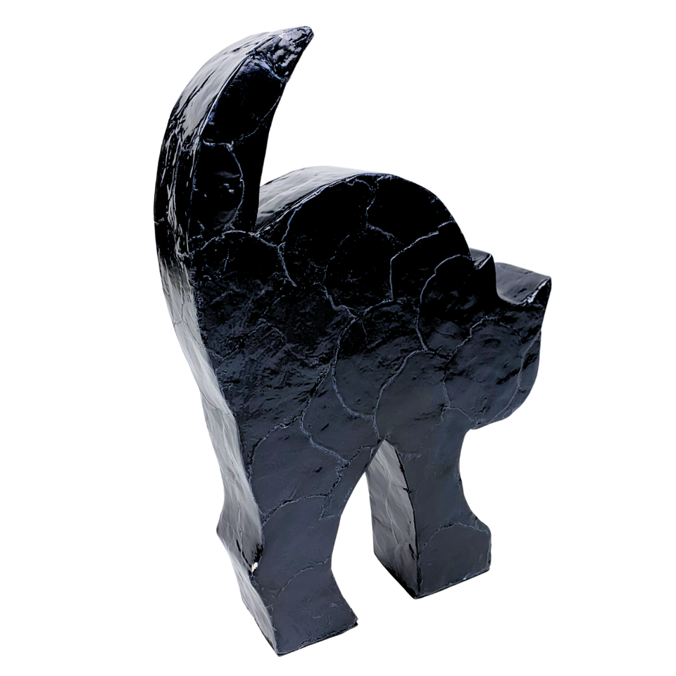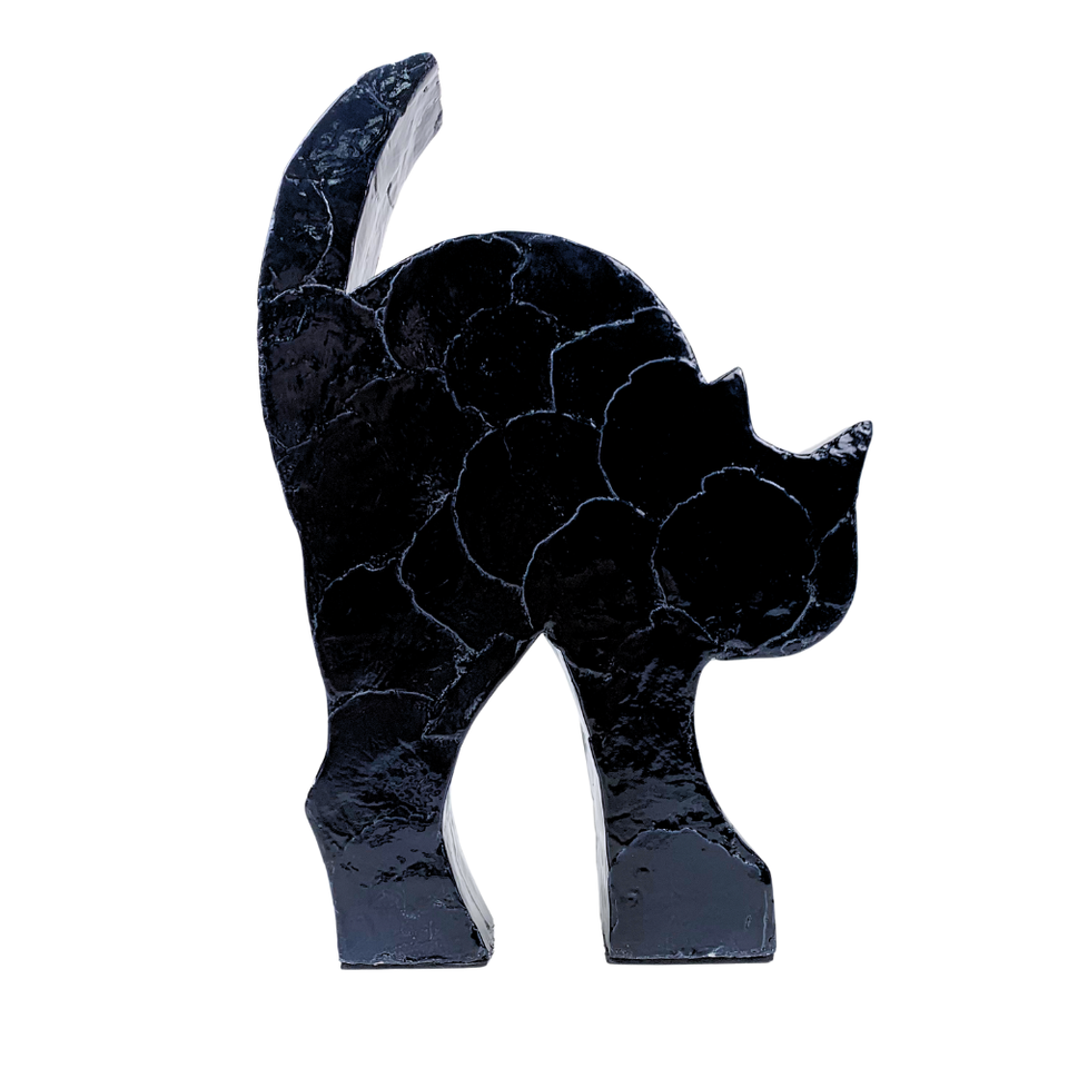 งานประติมากรรมแมวฮาโลวีนบนโต๊ะไม้ MDF ทำมือ สไตล์โมเดิร์น คุณภาพสูง ทนทาน ตกแต่งด้วยเปลือกหอยคาปิซ รูปแมวดำสุดเก๋ สำหรับตกแต่งบ้าน