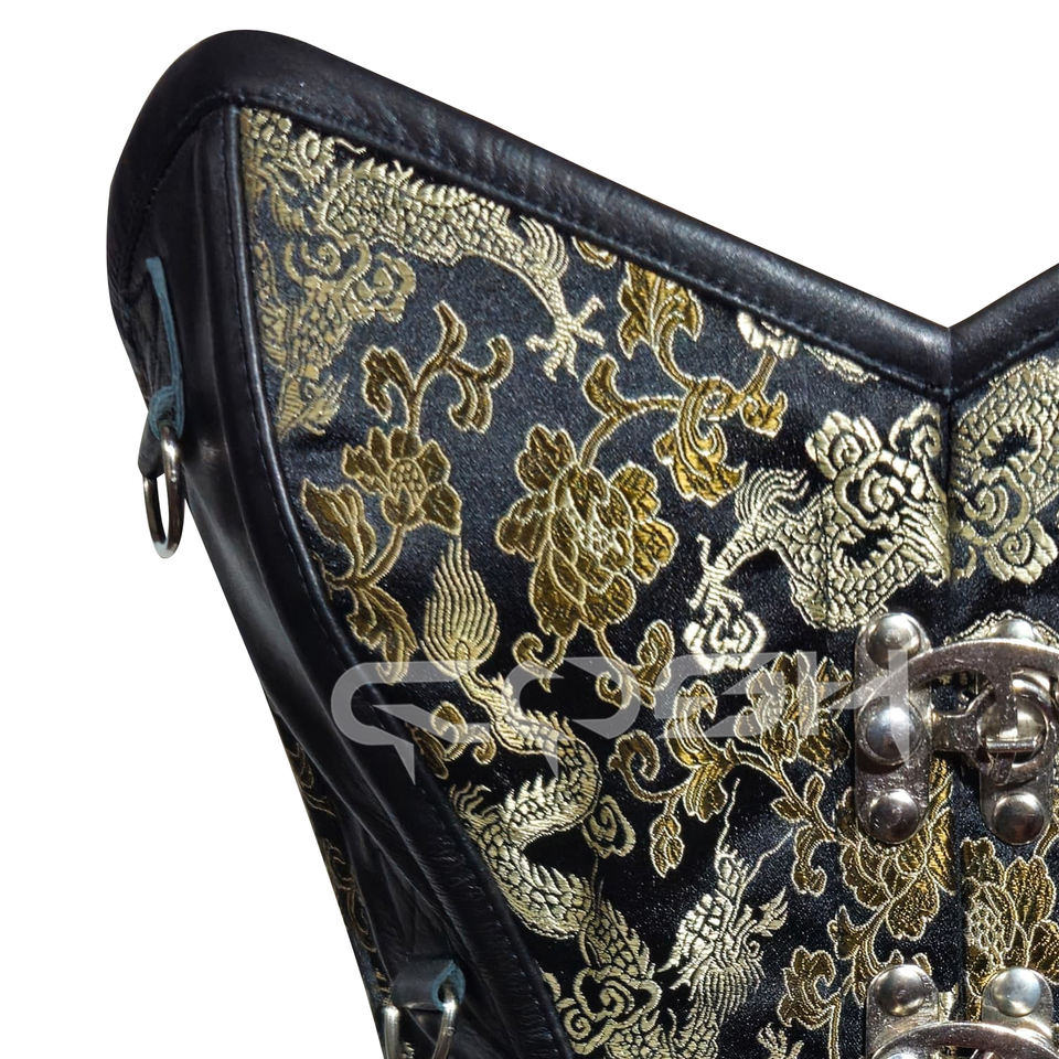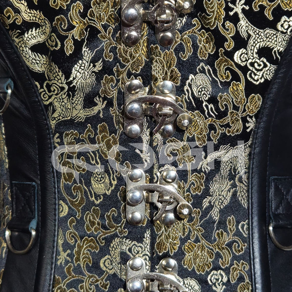 บัสติเยร์ผ้าไหมลายมังกรสีดำและสีทองคุณภาพสูง พร้อมแผงด้านข้างหนังพรีเมียมและฮาร์ดแวร์สีเงิน