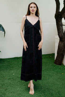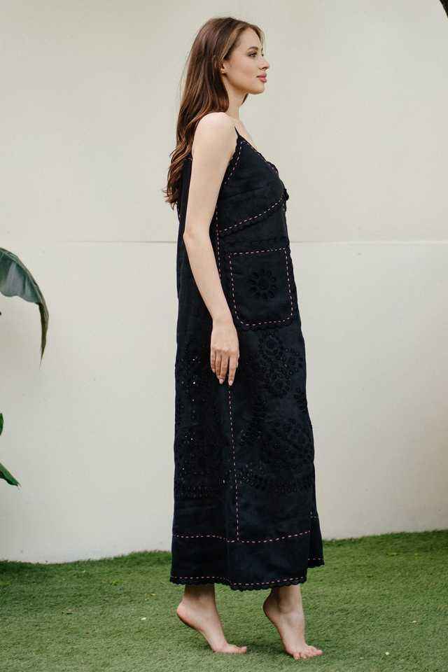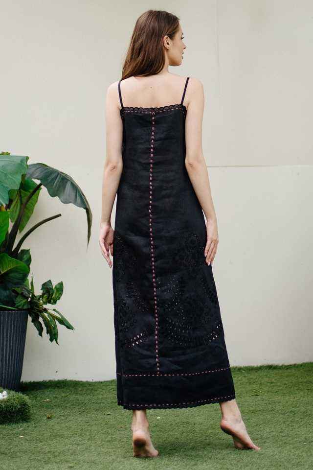 ชุดเดรสผ้าลินินสีดำคุณภาพสูงชุดเดรสยาวปักลายดอกไม้สวยสไตล์หรูหราไม่ซ้ำใครสำหรับผู้หญิงวิธีการทอ