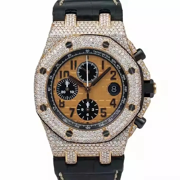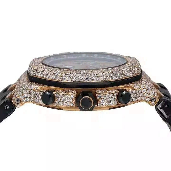 นาฬิกาข้อมือผู้ชายแฟชั่น ดีไซน์หรูหรา ประดับเพชรโมอิสซาไนต์สีดำคุณภาพสูง ระดับความใส VVS หน้าปัดควอตซ์แบบอนาล็อก กระจกอัจฉริยะ