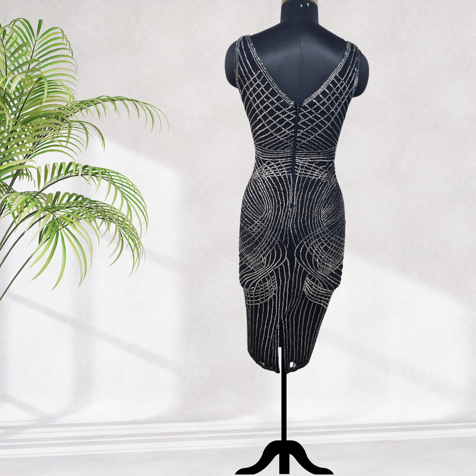 ชุดราตรียาวคลุมเข่าแขนกุดสีดำสำหรับผู้หญิงชุดเดรสปักลายเกลียวสีเงินประดับลูกปัดสำหรับธรรมชาติ