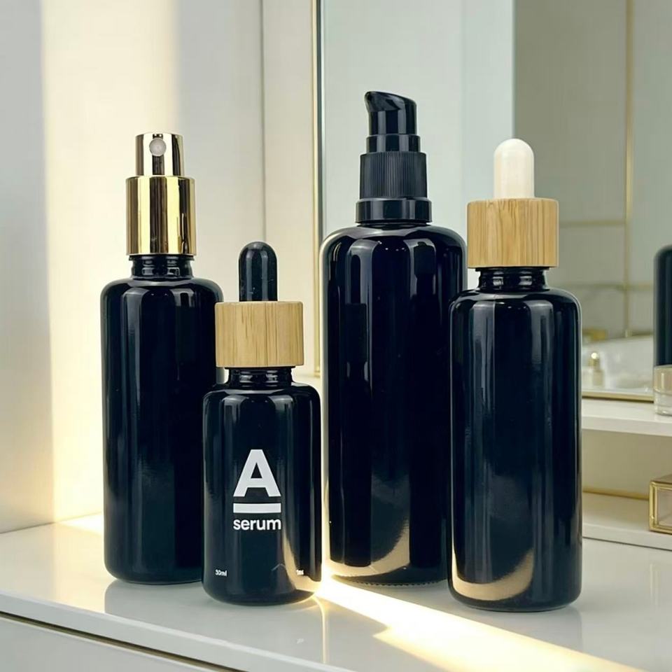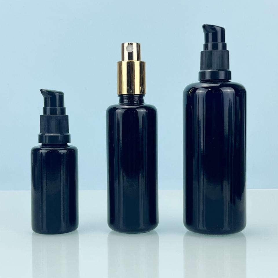 ขวดแก้วหยดน้ำมันหอมระเหยสีม่วงดำคุณภาพสูง ขนาด 30 มล. 50 มล. 60 มล. 100 มล. ขวดโลชั่นทรงกลมป้องกันรังสียูวี