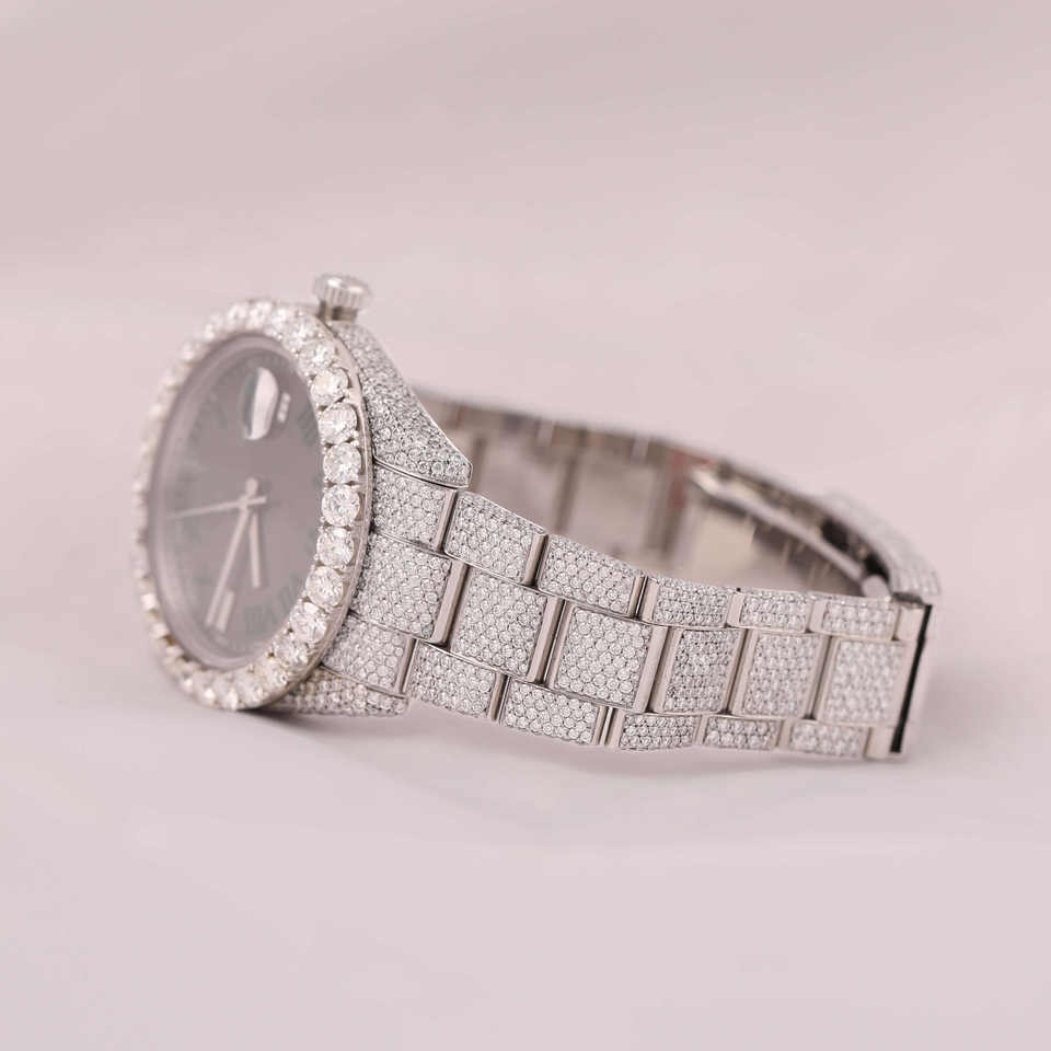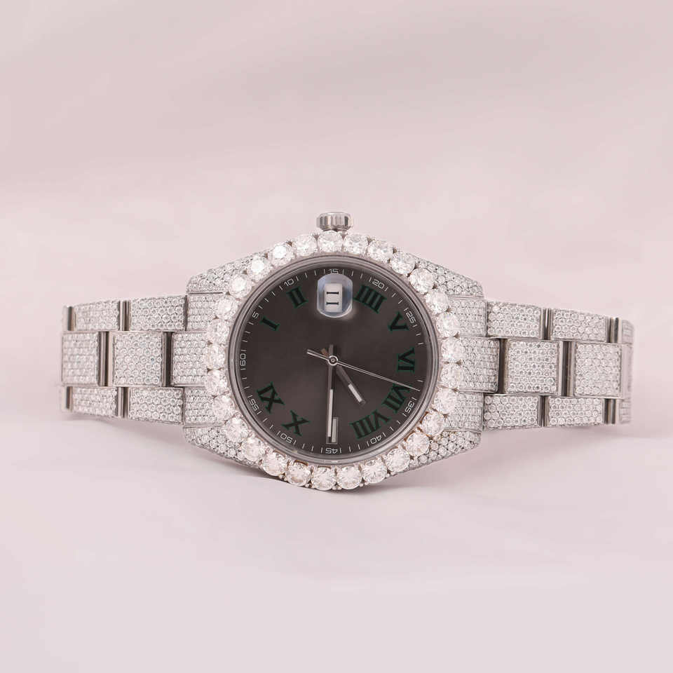 นาฬิกาข้อมือสุดหรูคุณภาพสูงสีเขียวแบบโรมันหน้าปัดสีเทา VVS Moissanite อะนาล็อกแสดงหน้าต่างกระจก