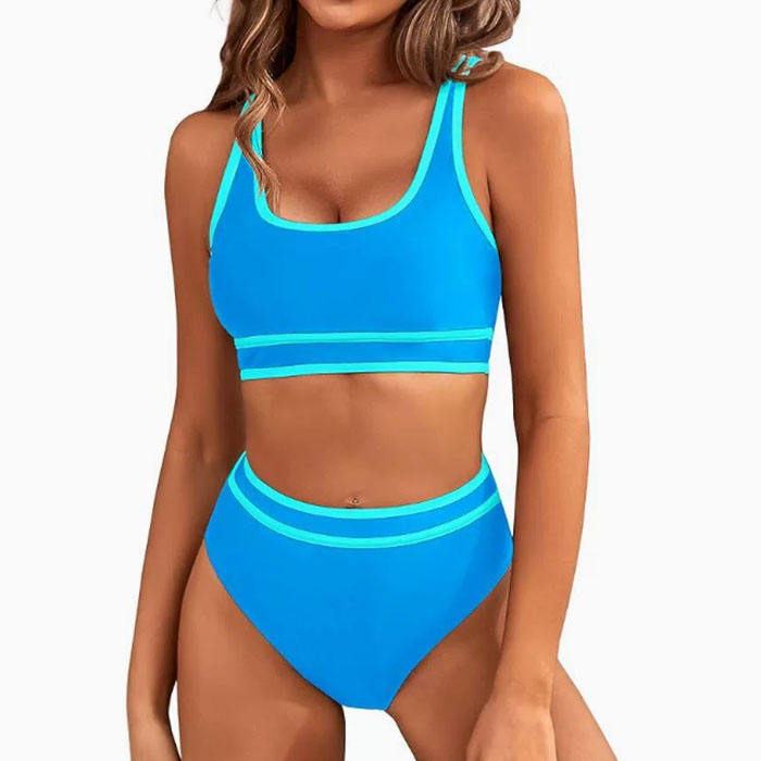 ชุดว่ายน้ำบิกินี่เอวสูงคอทรงสี่เหลี่ยมสีฟ้า2ชิ้นพร้อมโลโก้ด้านหน้า