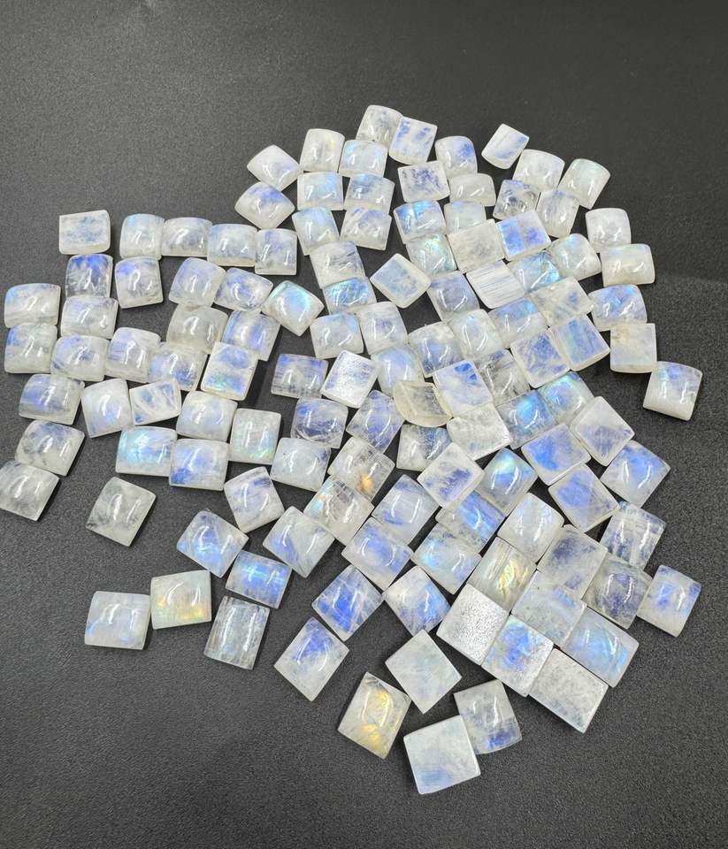 หินมูนสโตนสีกรมท่าแวววาวสีรุ้ง8มม.-9มม. พลอยธรรมชาติทรงหลวมสี่เหลี่ยมเรียบสำหรับการทำเครื่องประดับ