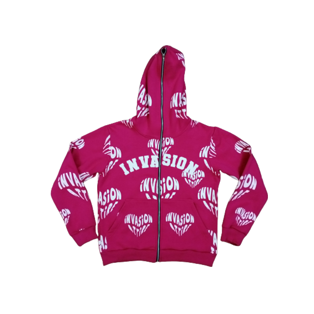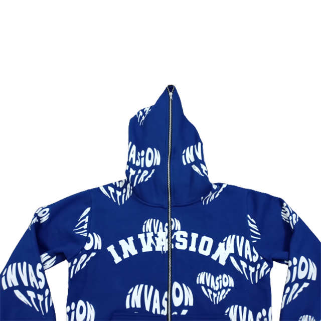 เสื้อมีฮู้ดแบบซิปรูดผ้าขนแกะสีน้ำเงินออกแบบลายกรดซักได้เองพร้อมพิมพ์โลโก้พัฟทั่ว
