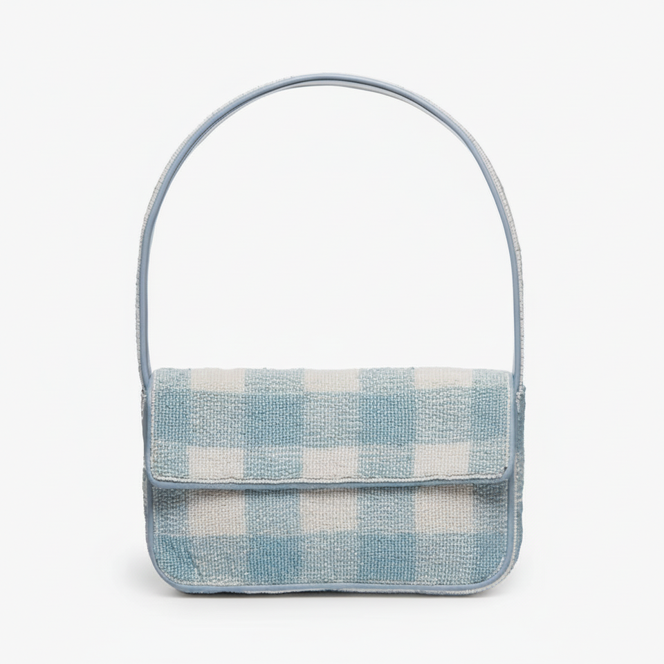 กระเป๋าถือทรงสี่เหลี่ยมผ้าลายตารางสีน้ำเงินคุณภาพสูงประดับลูกปัด เหมาะสำหรับผู้หญิง ใช้สะพายไหล่ ตกแต่งด้วยลูกปัดเม็ดเล็ก สำหรับงานแต่งงานในฤดูร้อน