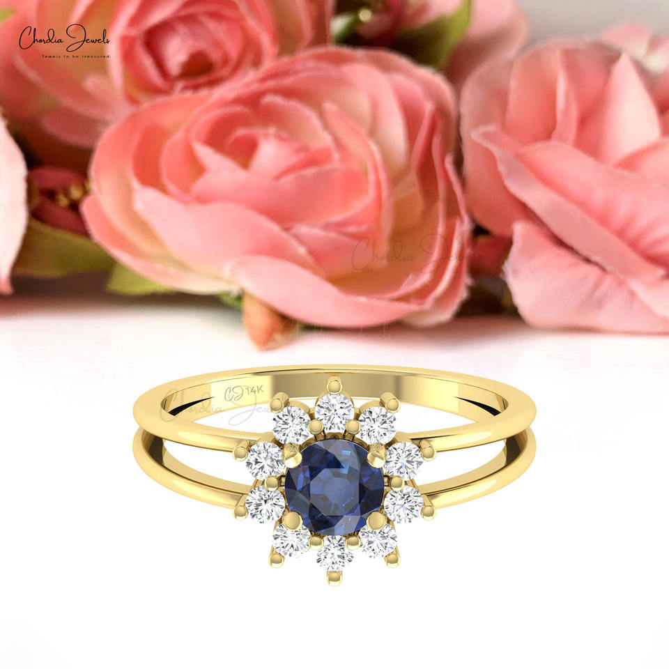 แหวนหมั้นแยกก้านไพลินและเพชรสีทอง14K แหวนอัญมณีทรงกลมตัดขนาด5มม.