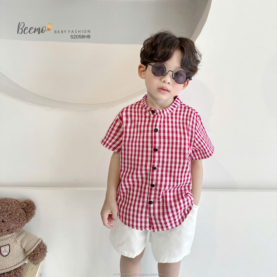 ชุดเสื้อผ้าเด็กผู้ชายคอจีนเสื้อลายสก็อตสีแดงและกางเกงขาสั้น