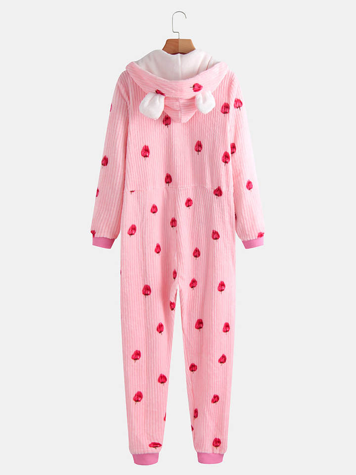 High Quality Branded 100% Cotton Custom Jumpsuits Pajamas Fruits Print Casual Striped Hooded Front Zipper Sleepwear